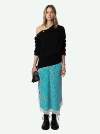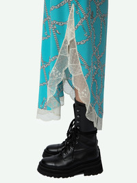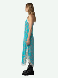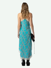 Blue lingerie-style silk maxi dress with ZV chain motifs and lace straps and trims. Description & details - Women’s Aqua blue lingerie-style silk maxi dress - Chain and ZV signature motifs and lace strips - V-neckline - Thin non-adjustable straps - Slits at the bottom This French lace was made by Sophie Hallette exclusively for Zadig&Voltaire. Model is 175 cm / 5' 8" and is wearing a size S This item is true to size. We recommend buying your usual size. Composition 100% SILK Care - Hand-wash or machine-wash inside out in a mesh laundry bag on a 20°C delicate cycle with a maximum spin speed of 400 rpm - Air dry flat - Iron inside out at a maximum of 110°C Product code: WWDR01362_AQUA