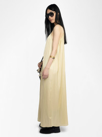 Long dress in Japanese satin, lingerie spirit, draped, adjustable back straps and metal wings on front neckline. Description & details - Long dress in Japanese satin - V-neckline - Thin, adjustable and crossed straps - Metal wings on the front neckline - Draped and fluid cut Model is 180 cm / 5' 10" and is wearing a size S This item fits true to size. Choose your usual size. Composition 57% Polyester** 43% Polyester Care - Hand-wash or machine-wash inside out in a mesh laundry bag on a 20°C delicate cycle with a maximum spin speed of 400 rpm - Air dry flat - Iron inside out at a maximum of 110°C Product code: WWDR02587_BLOND