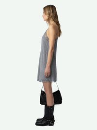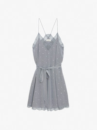 Grey lingerie-style silk mini dress with all-over diamante, lace trims and a tie at the waist. Description & details - Women’s Iron grey silk mini dress - Dotted swiss with all-over silver-colored diamante and contrasting patterned lace - V-neckline - Removable tie belt - Thin non-adjustable straps - Asymmetric hem with lace edging Model is 175 cm / 5' 8" and is wearing a size S This item is true to size. We recommend buying your usual size. Composition 100% SILK Care - Hand-wash or machine-wash inside out in a mesh laundry bag on a 20°C delicate cycle with a maximum spin speed of 400 rpm - Air dry flat - Iron inside out at a maximum of 110°C Product code: WWDR01361_IRON
