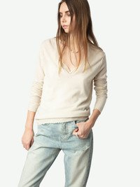 Long-sleeved V-neck sweater. Description & details - Sweater in 100% featherweight cashmere - V-neck - Long sleeves, ribbed edges with worn effect and ZV pointelle signature - Naturally warm, featherweight cashmere is lighter and more delicate than classic cashmere. It is knitted more finely, making it an exceptional piece. Model is 176 cm / 5' 9" and is wearing a size S This item is true to size. We recommend buying your usual size. Composition 100% Cashmere Care - Hand-wash or machine-wash on a 20°C wool cycle with a maximum spin speed of 400 rpm - Do not wring - Air dry flat - Iron inside out at a maximum of 110°C, avoiding any customised details Product code: KWSW01661_ECRU