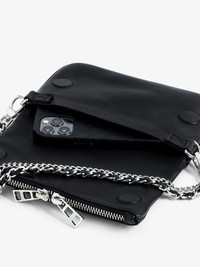 Rock Nano iconic women’s black leather clutch. Description & details - Rock Nano iconic women’s black leather clutch - Two removable chains, one interwoven with leather and the other metal - Flap with magnetic closure - Zipped back pocket - Diamante-embellished wings - Carry by hand, over the shoulder or across the body - Big enough for a mobile phone up to 6.1 inches (e.g. iPhone 12/13/14/15) 11 x 2 cm Composition 100% Cow leather Care - Protect your leather item from humidity and any source of heat (radiator, sun) - Avoid your item coming into contact with water - Regularly care for your leather item using a colourless nourishing cream for leather, suitable for leather goods - Ensure you wear your item with similar colours - Avoid overfilling your bag to ensure its durability - In case of stains, contact a leather professional Product code: LWBA03975_BLACK