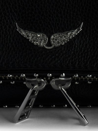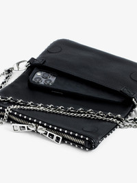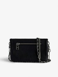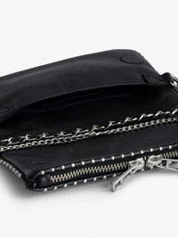 Women's black mini clutch in leather, embellished with studs. Description & details A nano version of the iconic Rock clutch, for carrying just the essentials. Carry as a clutch or wear across the body: this bag is an essential for days and evenings. This leather version is embellished with crystal-set wings, as well as a double chain woven with leather, allowing you to wear it across the body or on the shoulder. - Zadig&Voltaire Women’s Rock Nano clutch in black leather with silver-toned studs - Flap with magnetic closure - Removable leather and metal chain - Zipped back pocket - Rhinestone wings charm Width x Height: 17,5 x 9 cm. Chain straps drop: 23 cm and 61 cm Composition 100% COW LEATHER Care Do not expose your item to a source of heat or to sunlight for a prolonged period. In the event of accidental exposure to water, leave your item to dry at room temperature, away from direct light. Avoid routinely overloading your handbag or clutch. To prolong its life, store your item in a dust bag and pad it with tissue paper to maintain its shape. To maintain the shine of your smooth or grained leather item, use a leather cream or polish. Product code: WHAP2017F_NOIR