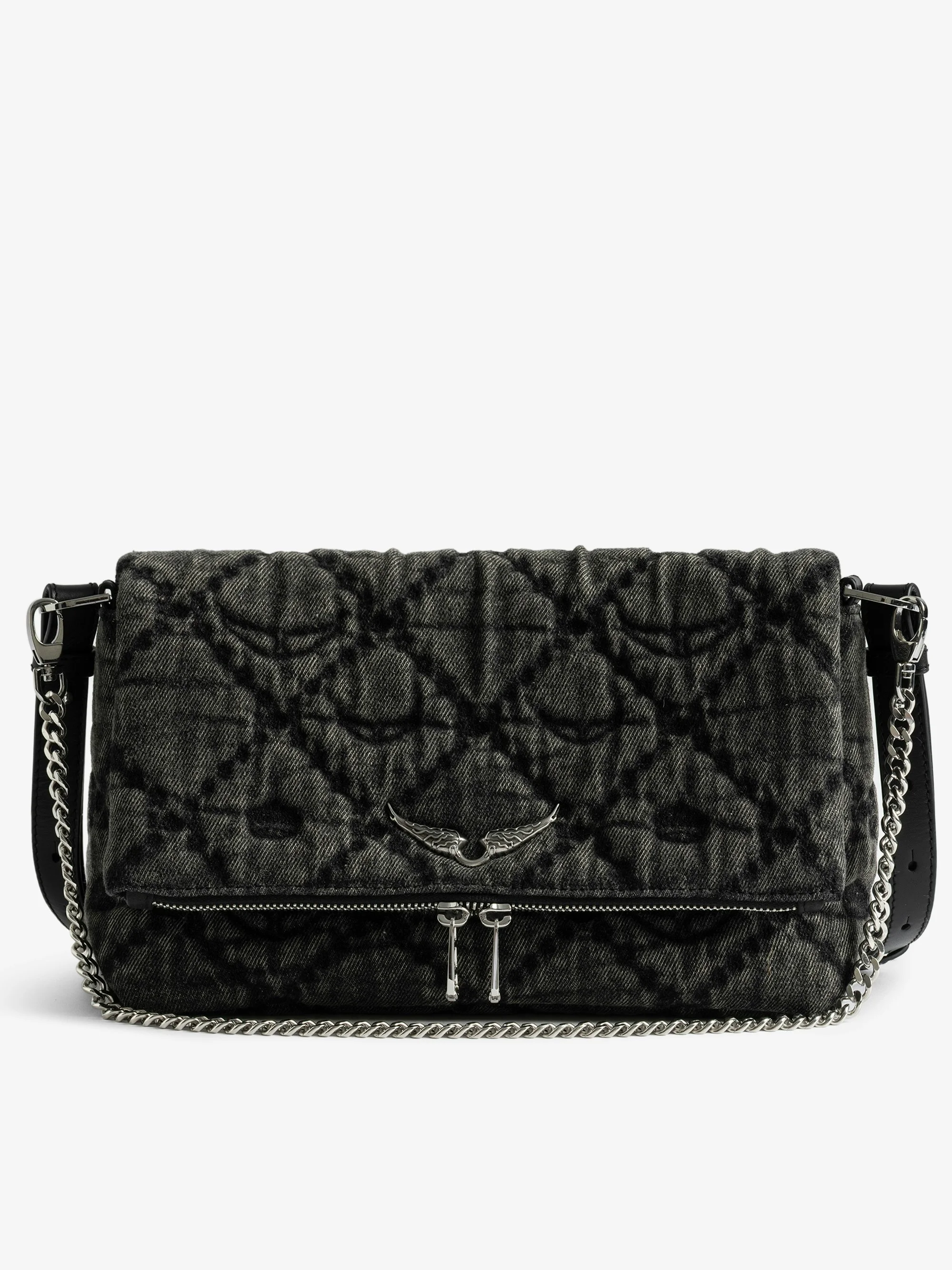 Denim monogram shoulder bag with chain and signature wings. Description & details - Washed and quilted denim bag with monogram animation - Adjustable and removable leather shoulder strap with eyelets for attaching accessories - Sliding metal chain with signature eyelets - Zip closure with signature wings puller - Flat back pocket with magnetic closure - Interior patch pocket - Raised signature wings - Shoulder or cross-body wear 27 x 15 x 10 cm Composition 60% Cotton** 40% Cotton Product code: LWBA04065_ROAD