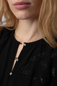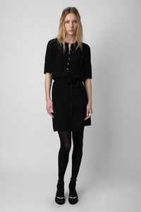 Women’s short black tie-waist dress embellished with diamanté wings and fastening. Description & details - Women’s short cinched-waist dress - Round neckline, short puffed sleeves - Smocked back with pleats - Button fastening and belt tied at the waist - Diamanté wings at the side Model is 175 cm / 5' 8" and is wearing a size S This item is true to size. We recommend buying your usual size. Composition 100% VISCOSE Care Hand-wash or machine-wash your garment at a maximum of 68°F, in a mesh laundry bag and inside out, with a gentle spin cycle. Air-dry. Iron your garment on a low heat setting or steam from a distance of 8 in, being particularly careful with customized details. Product code: WWDR01247_NOIR