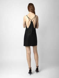 Women’s short black silk dress with all over diamanté and cross straps. Description & details - Women’s short black silk flowing dress - Diamanté - V neckline and thin cross straps Model is 180 cm / 5' 10" and is wearing a size S This item is true to size. We recommend buying your usual size. Composition 100% SILK Care Your dress should be dry-cleaned only. Product code: WWDR01260_NOIR