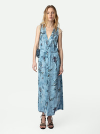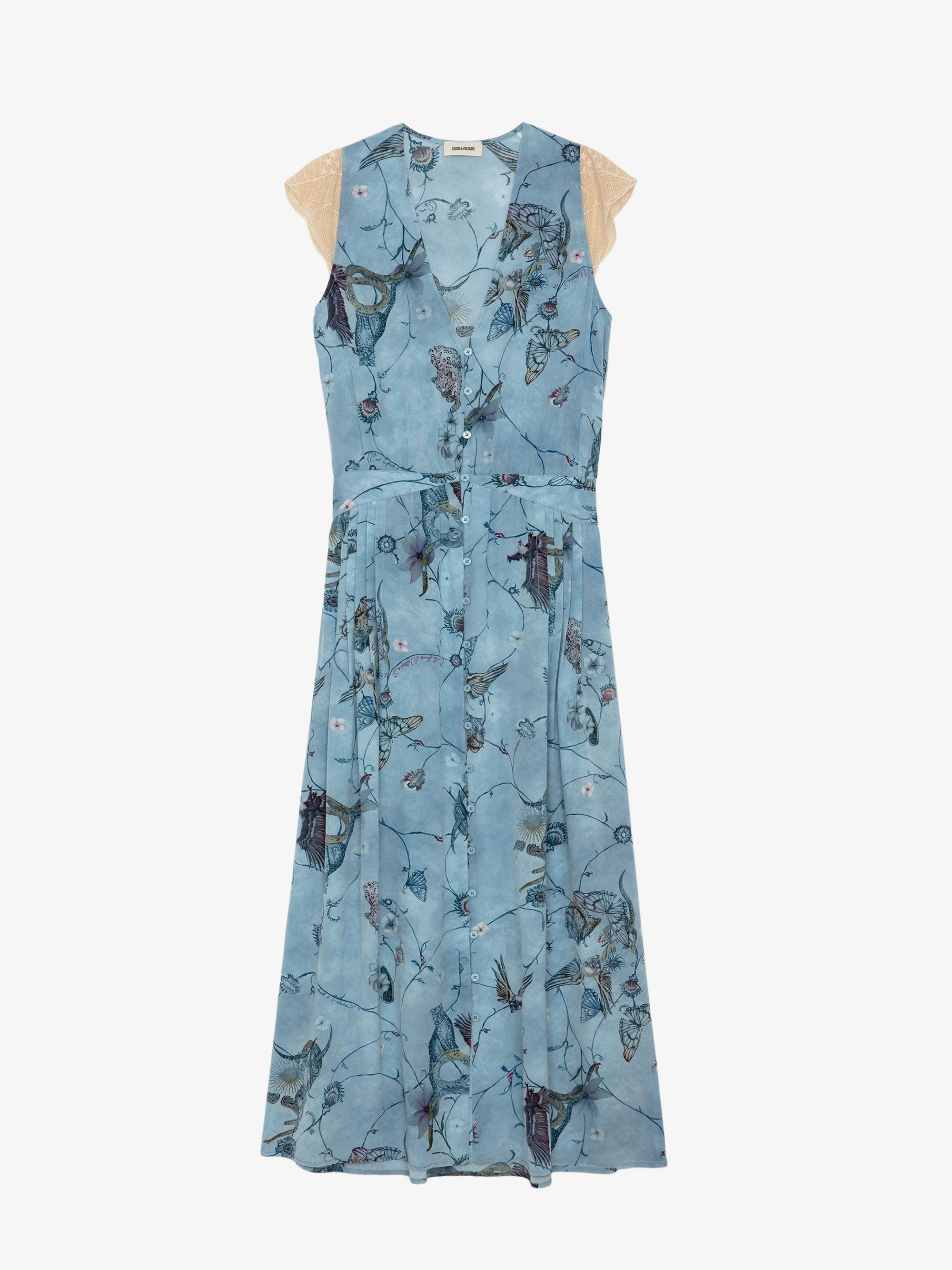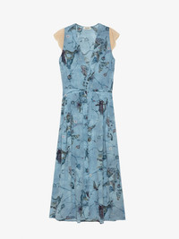 Women’s blue silk lingerie-style long dress with print and lace shoulders. Description & details - Women’s Glacier blue lingerie-style long dress with no sleeves - Print designed by Holly Biörklund, British artist and muralist who creates surrealist landscapes very much inspired by nature, animals and poetry - V neckline and contrasting patterned lace shoulders - Button closure and pleat details - Skirt with split Model is 178 cm / 5' 10" and is wearing a size S This item is true to size. We recommend buying your usual size. Composition 100% SILK Care - Hand-wash or machine-wash inside out in a mesh laundry bag on a 20°C delicate cycle with a maximum spin speed of 400 rpm - Air dry flat - Iron inside out at a maximum of 110°C Product code: WWDR01321_GLACIER