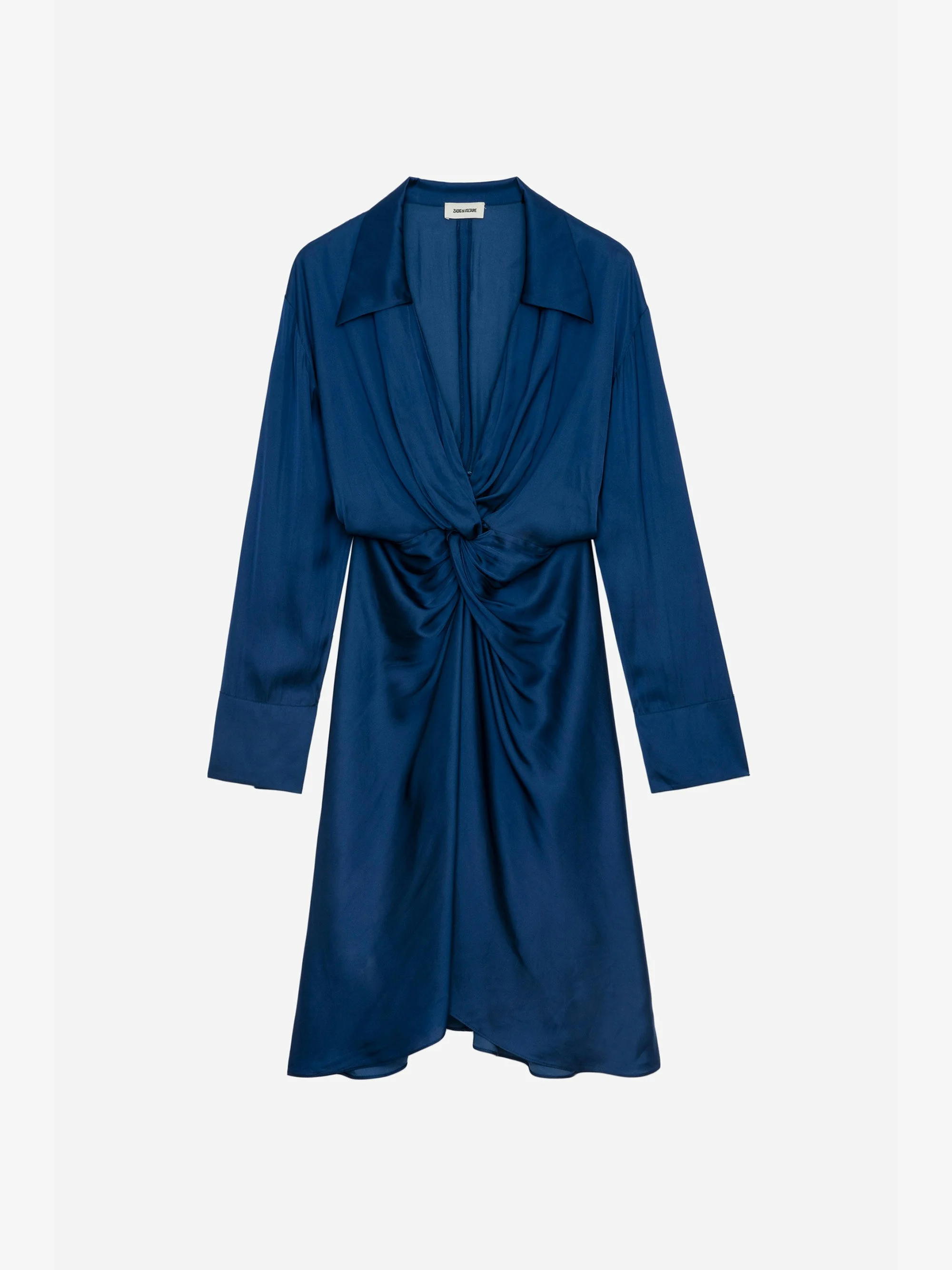 Women’s royal blue draped satin midi dress with asymmetric sleeves. Description & details - Women’s fitted royal blue satin midi dress - Shirt collar and deep neckline - Draped at the waist - Zip closure at the back - Long sleeves and split cuffs Model is 177 cm / 5' 9" and is wearing a size S This item is true to size. We recommend buying your usual size. Composition 57% POLYESTER** 43% POLYESTER Care Follow the washing and care instructions on the composition label sewn onto the product. Product code: WWDR00023_BLEU ROI