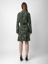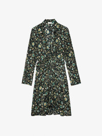 Women’s black floral-print silk midi dress draped at the waist. Description & details - Women’s fitted black midi dress - Floral-print silk - Shirt collar and deep neckline - Draped at the waist - Zip closure at the back - Long sleeves and split cuffs Model is 180 cm / 5' 10" and is wearing a size S This item is true to size. We recommend buying your usual size. Composition 100% SILK Care Hand-wash or machine-wash your garment at a maximum of 68°F, in a mesh laundry bag and inside out, with a gentle spin cycle. Air-dry. Iron your garment on a low heat setting or steam from a distance of 8", being particularly careful with customized details. Product code: WWDR01264_NOIR