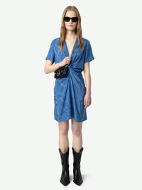 Short draped dress in jacquard silk, short sleeves. Description & details - Short silk dress - Chain jacquard - Deep V-neck - Draped at the waist - Short sleeves - Asymmetrical hem Model is 171 cm / 5' 7" and is wearing a size S This item is true to size. We recommend buying your usual size. Composition 100% Silk Care - Hand-wash or machine-wash inside out in a mesh laundry bag on a 20°C delicate cycle with a maximum spin speed of 400 rpm - Air dry flat - Iron inside out at a maximum of 110°C Product code: WWDR02420_SURF