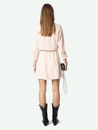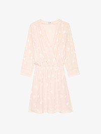 Romantic yet playful, this pink ruched mini dress features the signature Flash Hearts print and a flattering draped silhouette. With its wrap-style neckline, ruched waist, and cascading ruffle details, it’s designed to hug in all the right places. A statement piece for day-to-night dressing, this pink ruched mini dress delivers effortless femininity with a touch of edge. Description & details -Women’s Pearly pink ruched mini dress adorned with the bold Flash Hearts print -Crossover wrap neckline secured with a hidden press stud for a refined finish -Elasticated waist creates a cinched silhouette, complemented by pleated draping throughout -Draped skirt with full ruffle panels adds volume and movement -A chic and flirty pink ruched mini dress perfect for parties, dinners, or weekend outings This item fits true to size. Choose your usual size. Composition 100% Silk Product code: WWDR02526_PEARLY