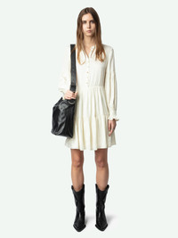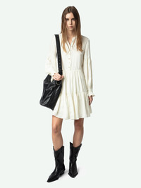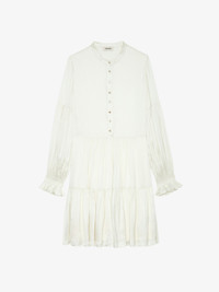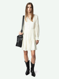 Short dress in Japanese satin, long sleeves and buttoned neckline. Description & details - Short dress in Japanese satin - Round neck and jewel button fastening - Long sleeves with ruffled cuffs - Slightly flared skirt - Pleated and ruffled details Model is 176 cm / 5' 9" and is wearing a size S This item is true to size. We recommend buying your usual size. Composition 57% Polyester** 43% Polyester Care - Hand-wash or machine-wash inside out in a mesh laundry bag on a 20°C delicate cycle with a maximum spin speed of 400 rpm - Air dry flat - Iron inside out at a maximum of 110°C Product code: WWDR02451_FLAKE