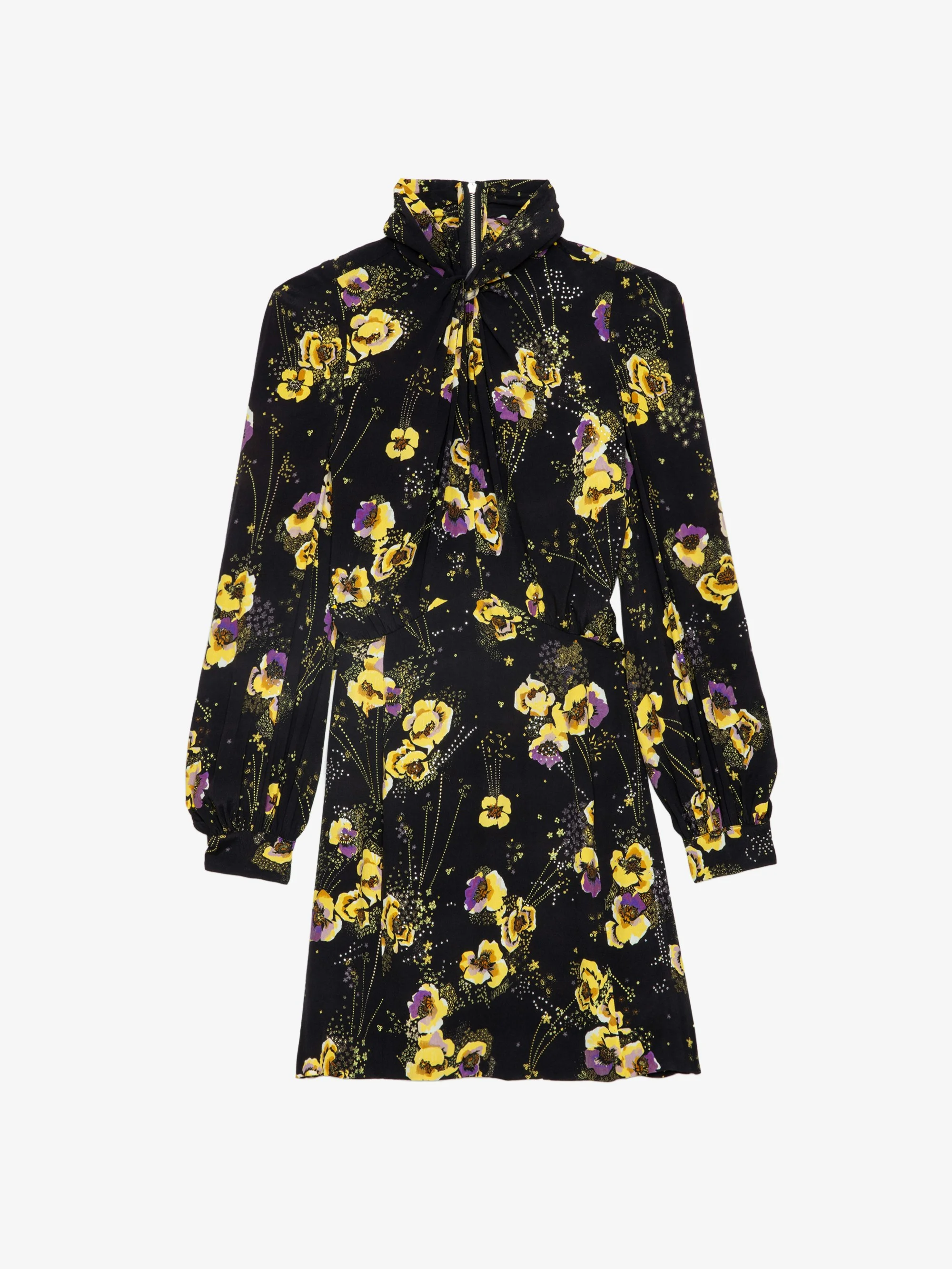 Black crepe minidress with diamante, Yoko floral print, tied collar and long sleeves. Description & details - Women’s black crepe minidress - Yoko floral print and diamante - Tied round collar and low-cut neckline - Zip fastening at the back - Long wide sleeves and buttoned cuffs If you’re between two sizes, we recommend choosing the larger size. Composition 100% Viscose Care - Hand-wash or machine-wash inside out in a mesh laundry bag on a 20°C delicate cycle with a maximum spin speed of 400 rpm - Air dry flat - Iron inside out at a maximum of 110°C Product code: WWDR01398_NOIR