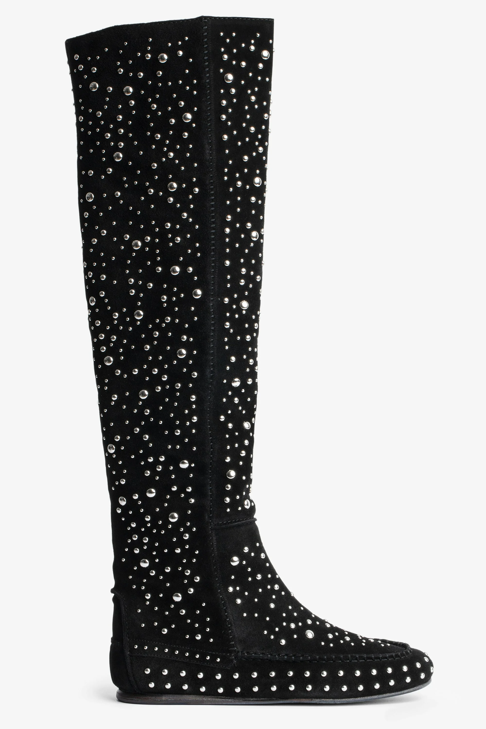 Women’s black suede knee-high boots with silver-tone studs and topstitching Description & details Folk and spectacular, the Santa boots in suede are among the collection’s must-haves. With their all-over studs, they add a boldly boho touch to the silhouette. - Women's Zadig&Voltaire suede knee-high boots - Silver-tone round studs - Inner zip fastening - Topstitching - Insole: 4.5cm - Made in Portugal - Product code: SWCT00791 Heel : 4 cm Composition 100% Cow leather Care Do not expose your item to a source of heat or to sunlight for a prolonged period. In the event of exposure to water, leave your item to dry at room temperature, away from direct light. Brush your shoes after every wear and let them rest as much as possible between each wear, with shoetrees inside them to let them breathe and to maintain their shape. For protection from rain and stains, your suede item needs waterproofing before you first use it. Product code: SWCT00791_NOIR