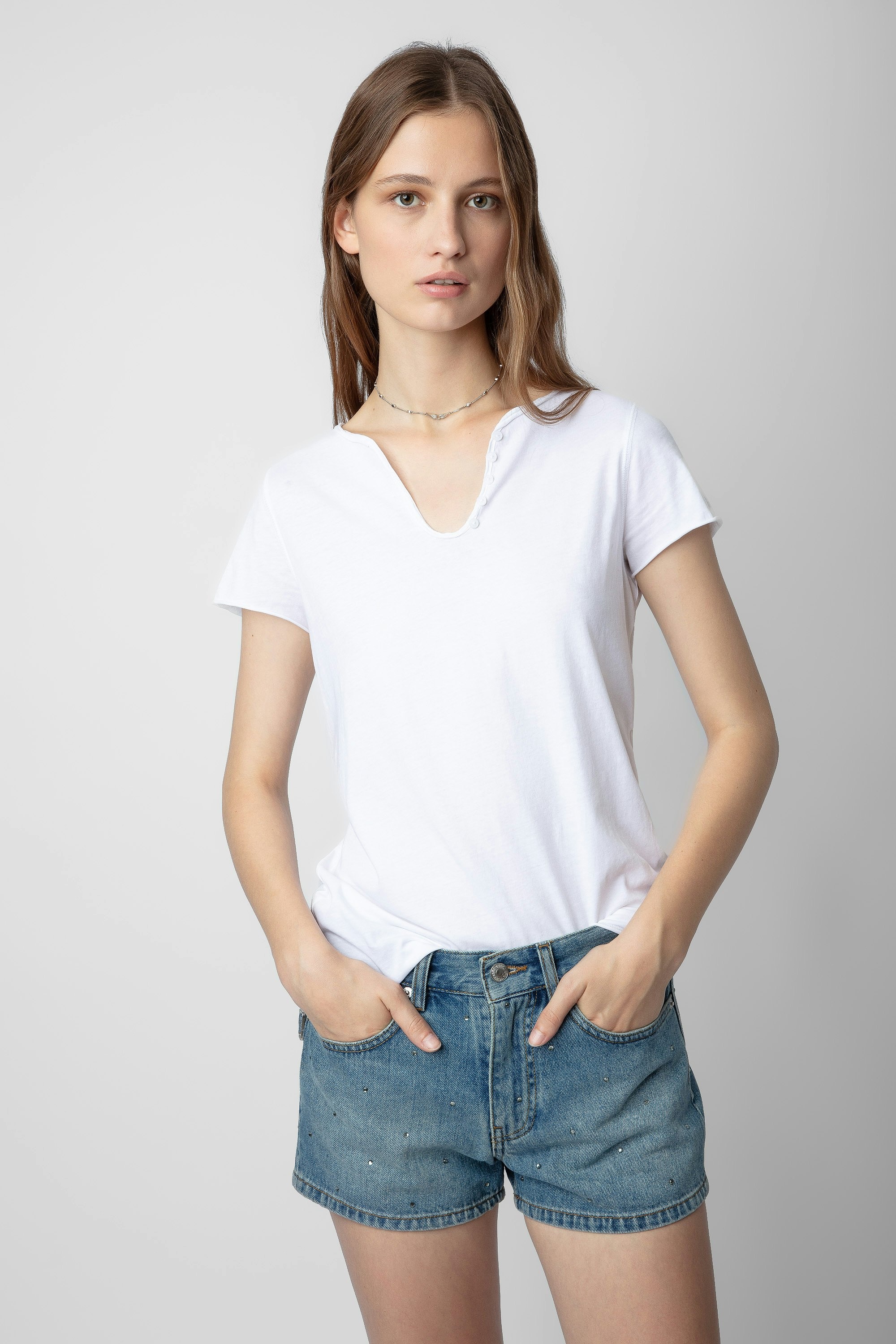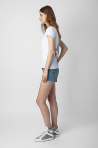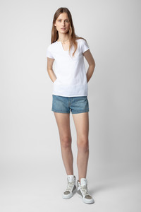 Women's denim shorts with diamanté embellishment. Description & details - Women's sky blue denim shorts - All-over diamanté embellishment - 5 pockets, belt loops at the waist - "Zadig Denim" jacron label on the back and metal strap at the side Model is 179 cm / 5' 10" and is wearing a size 36 This item is true to size. We recommend buying your usual size. Composition 100% COTTON* Care Machine-wash your denim garments inside out at a maximum of 86°F with similar colors and using liquid detergent. However, we recommend wearing your shorts at least 10 time before washing them. The spin cycle speed should not exceed 1,000 rpm. Iron your shorts on a moderate heat. Product code: WWBS00129_LIGHT BLUE