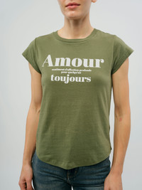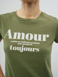 Slim T-shirt with subtle “Amour” print. Description & details Slim T-shirt with subtle “Amour” print. This item fits true to size. Choose your usual size. Composition 100% Cotton Product code: JWTS02898_USED KAKI
