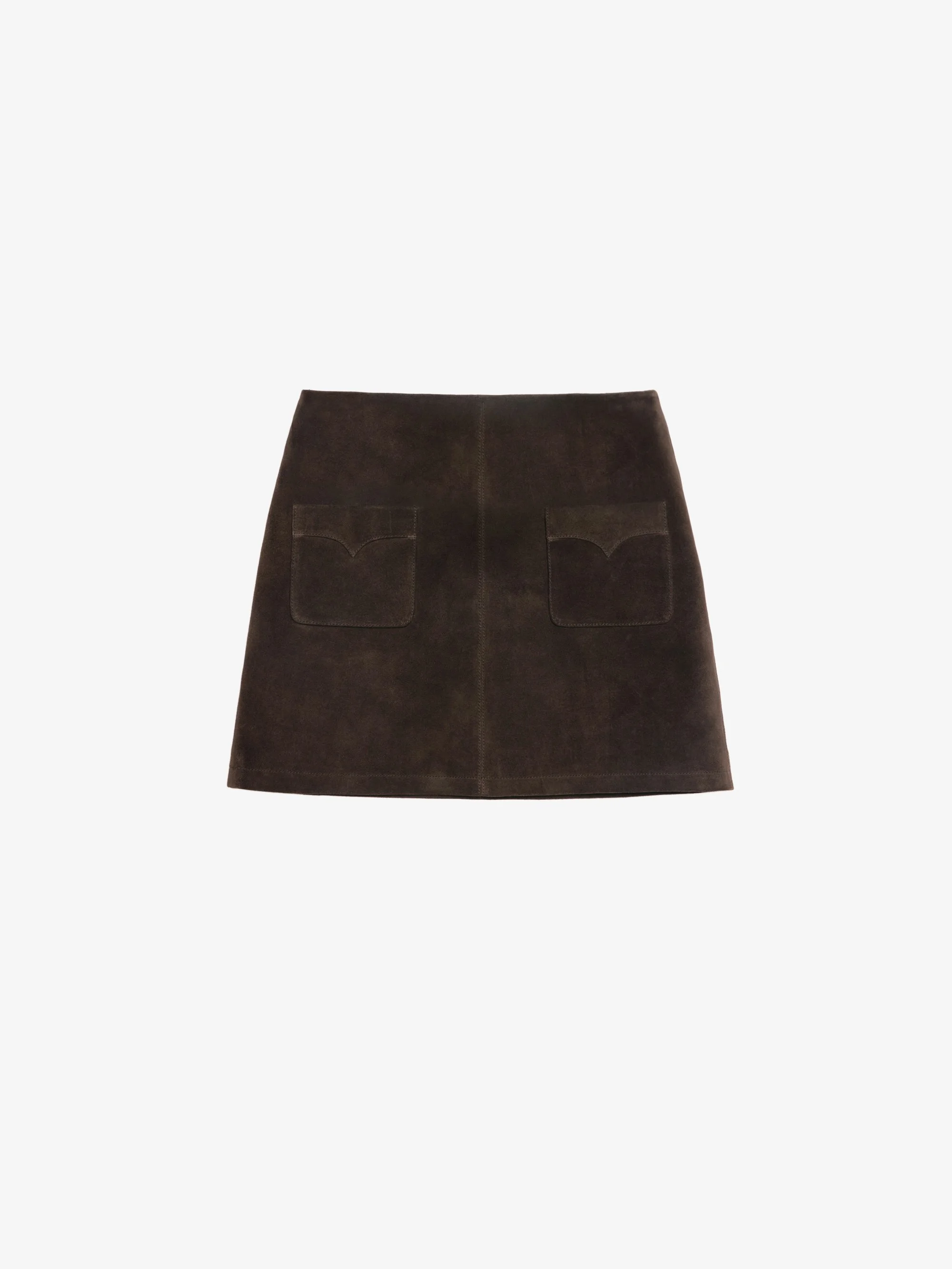 Short suede leather skirt with applied pockets and back zip fastening. Description & details - Suede leather skirt - Applied pockets - Back zip fastening - Short cut Model is 180 cm / 5' 10" and is wearing a size 36 This item fits true to size. Choose your usual size. Composition 100% Cow crust Care This garment should be cared for by a leather professional. Product code: RWSK01066_DARK CHOCOLATE