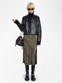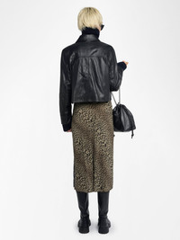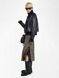 Mid-length lingerie-inspired viscose skirt with lace. Description & details - Mid-length skirt - Leopard print - Slit with lace - Back zip closure - Fluid fit Model is 180 cm / 5' 10" and is wearing a size S This item fits true to size. Choose your usual size. Composition 100% Viscose** Care - Hand-wash or machine-wash inside out in a mesh laundry bag on a 20°C delicate cycle with a maximum spin speed of 400 rpm - Air dry flat - Iron inside out at a maximum of 110°C Product code: WWSK01622_LEAVES