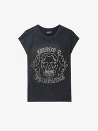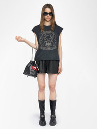 Sleeveless T-shirt with rhinestones on the front. Description & details - Tank top in 100% cotton - Rhinestone skull on the front - Round neck Model is 180 cm / 5' 10" and is wearing a size S This item fits true to size. Choose your usual size. Composition 100% Cotton** Care - Machine-wash inside out on a 30°C delicate cycle with similar colours - Air dry - Iron inside out at a maximum of 110°C, avoiding any customised details Product code: JWTT01275_BLACK