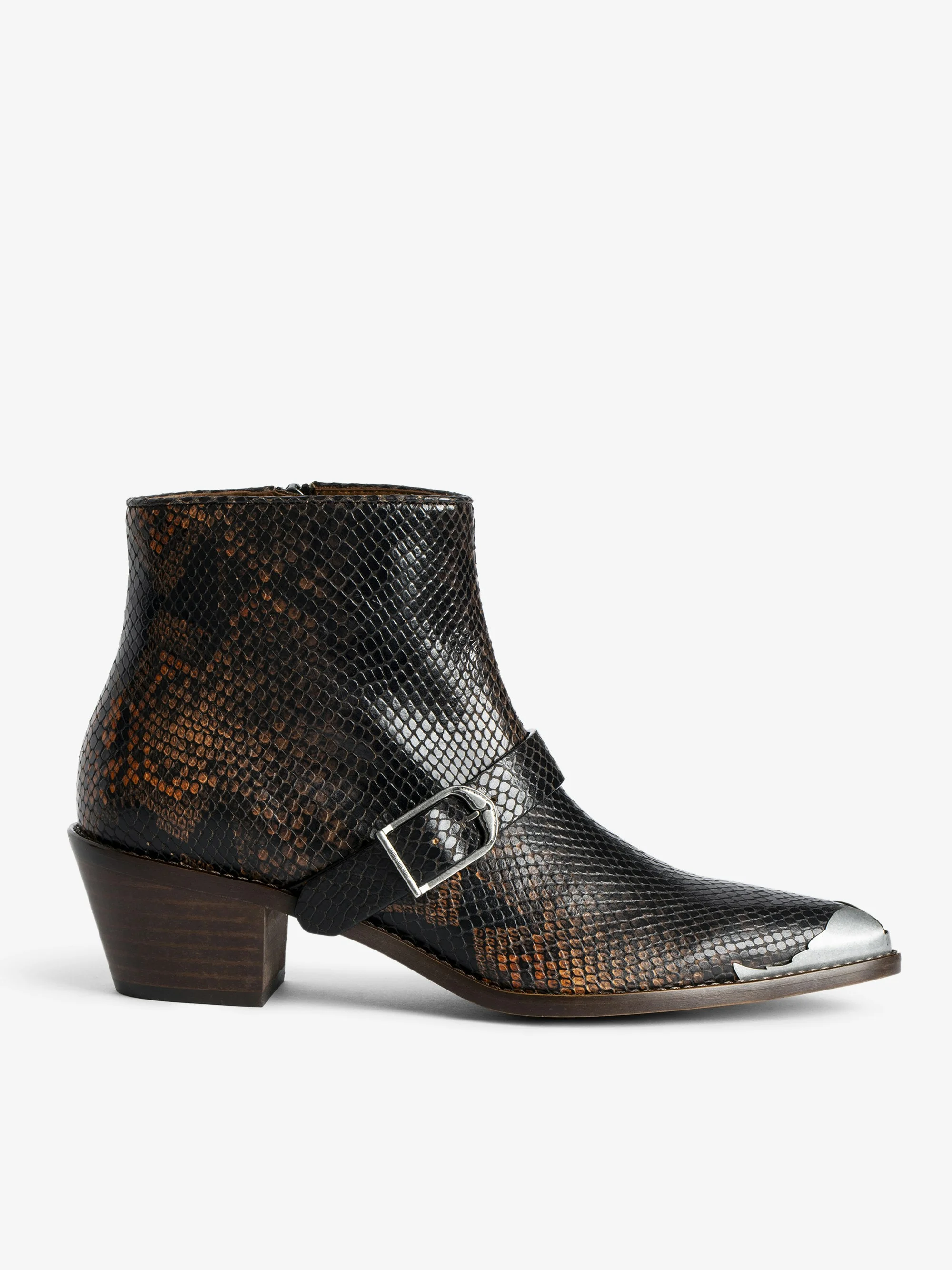 Bi-color leather ankle boots with python effect adorned with signature buckles and metallic wing-shaped studs. Description & details - Low ankle boots in bi-color python effect leather - Zip closure - Signature wing buckles - Pointed toe with metallic signature wing details This item fits true to size. We recommend choosing your usual size. Composition 100% Calfskin Care - Protect your leather item from humidity and any source of heat (radiator, sun) - Avoid your item coming into contact with water - Regularly maintain the shine of your smooth or grained leather shoes with a leather polish Product code: SWCT02067_FLAME