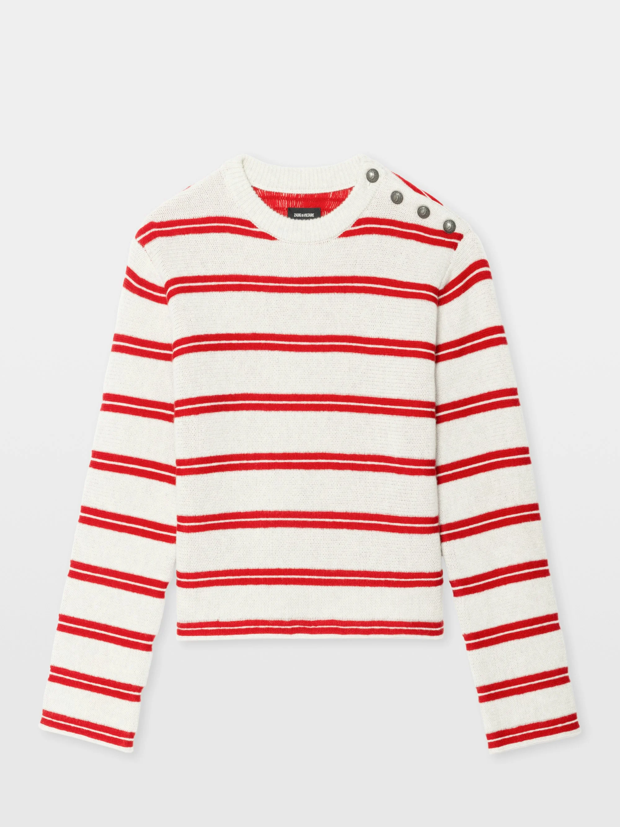 Round neck sweater with shoulder button fastening and horizontal stripes. Description & details - Wool and cashmere sweater - Horizontal stripe pattern - Round neckline - Shoulder button fastening - Long sleeves This item fits true to size. Choose your usual size. Composition 90% Wool* 10% Cashmere Product code: KWSW03057_GRIS CHINE CLAI