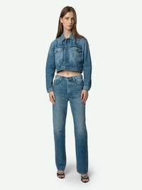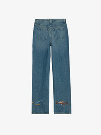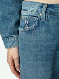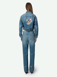 Women's straight leg light wash jeans with Roadrunner & Whiley Coyote patches. Description & details - Women's straight leg light wash jeans - Rips at knees and back pocket - Wings charm on back pocket - Hidden love note inside bottom hem with "Trust the Universe" embroidery - Roadrunner & Whiley Coyote patches on back of legs - Rise: 11 in. Composition 100% COTTON Product code: WWJE00261_LIGHT WASH