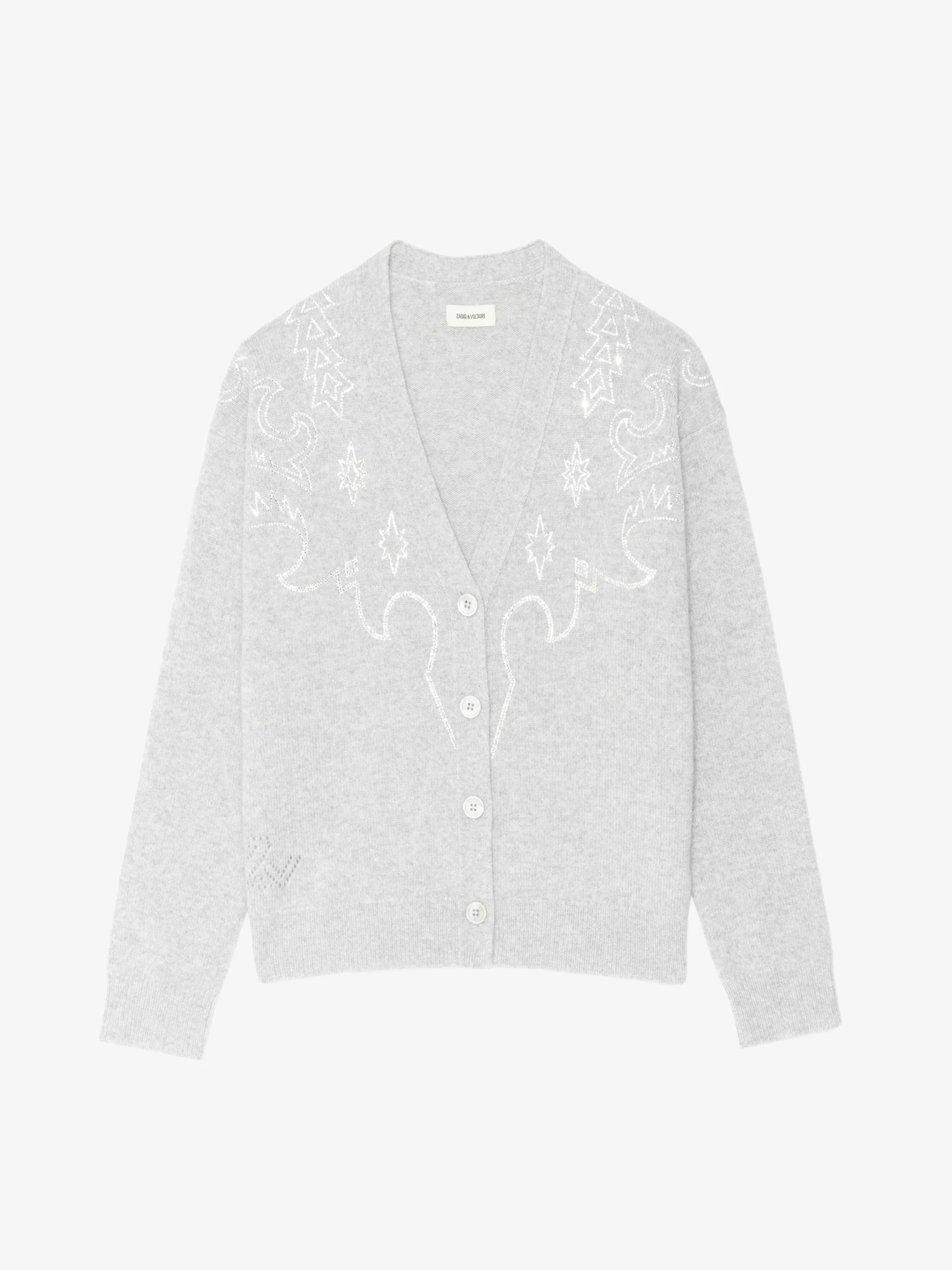 Buttoned cardigan with western rhinestones front and back. Description & details - Cardigan in 100% cashmere - Western rhinestones on front and back - V-neck - Button closure - Long sleeves Model is 177 cm / 5' 9" and is wearing a size S This item fits true to size. Choose your usual size. Composition 100% Cashmere Care - Hand-wash or machine-wash on a 20°C wool cycle with a maximum spin speed of 400 rpm - Do not wring - Air dry flat - Iron inside out at a maximum of 110°C, avoiding any customised details Product code: KWCA01646_GRIS CHINE CLAI