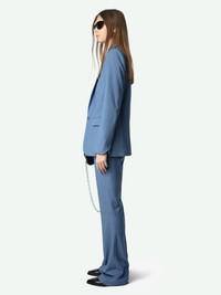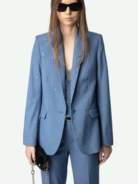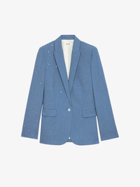 Structured straight blazer in mottled fabric with button fastening and star constellation rhinestones. Description & details - Structured straight blazer in mottled fabric - Star rhinestones - Pointed collar and button fastening - 2 flap pockets and 1 welt breast pocket - Back vent - Long sleeves and notched cuffs Model is 176 cm / 5' 9" and is wearing a size 36 This item is true to size. We recommend buying your usual size. Composition 64% Polyester** 35% Viscose 1% Elasthanne Care This garment should be dry-cleaned only. Product code: WWBL01882_SURF