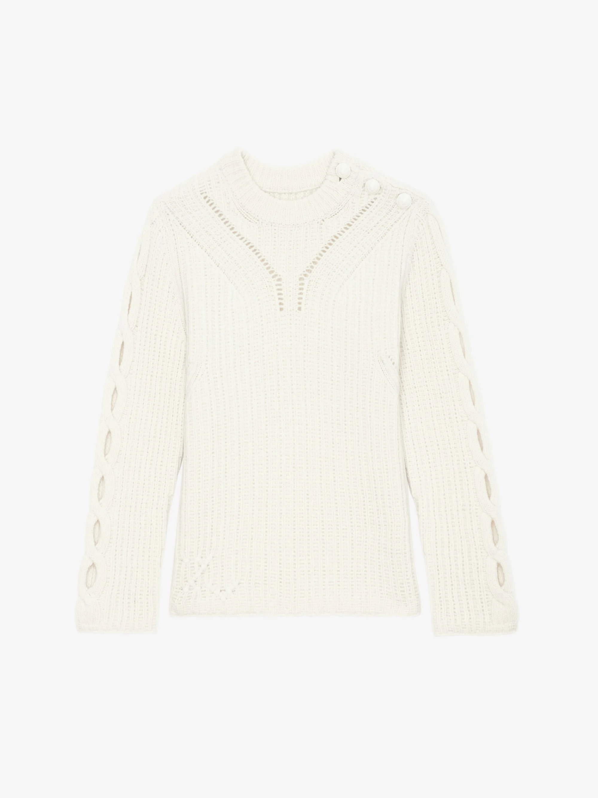 Long-sleeved thick sweater in ribbed ecru merino wool with openwork twists. Description & details - Women's Flake ecru thick ribbed merino wool sweater - Openwork details and openwork twists along the sleeves - Ribbed round neck - Long sleeves and rolled edges - ZV signature Model is 178 cm / 5' 10" and is wearing a size S This item is true to size. We recommend buying your usual size. Composition 100% Merino wool* Care - Hand-wash or machine-wash on a 20°C wool cycle with a maximum spin speed of 400 rpm - Do not wring - Air dry flat - Iron inside out at a maximum of 110°C, avoiding any customised details Product code: KWSW01658_FLAKE