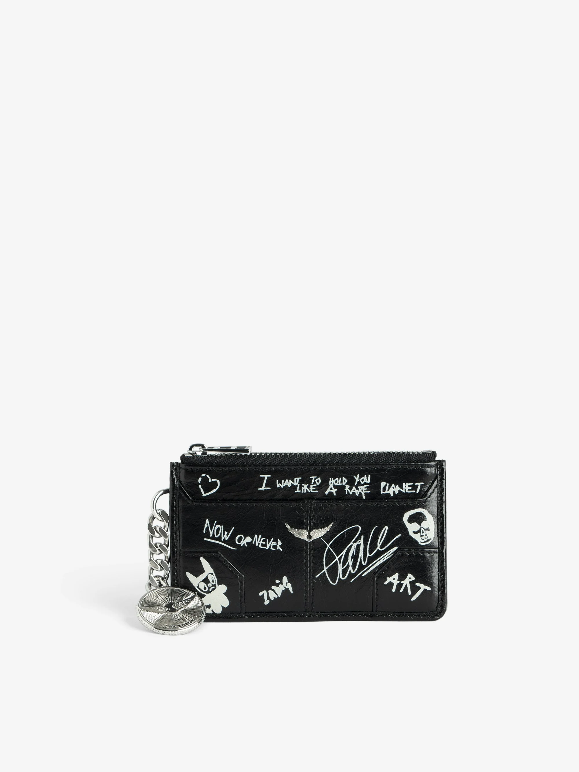 Card holder in vintage-effect patent leather with medallion and signature metal wings. Description & details - Women's vintage-effect black patent leather card holder - Zip fastening - 6 card slots, including 1 at the front and 5 at the back - Tag prints and signature metal wings - Small metal chain enhanced by its medallion - Embossed Zadig&Voltaire 13 x 7.5 cm Composition 100% Cow leather Care - Protect your leather item from humidity and any source of heat (radiator, sun) - Avoid your item coming into contact with water - Regularly care for your leather item using a colourless nourishing cream for leather, suitable for leather goods - Ensure you wear your item with similar colours - Avoid overfilling your bag to ensure its durability - In case of stains, contact a leather professional Product code: LWSG03654_NOIR