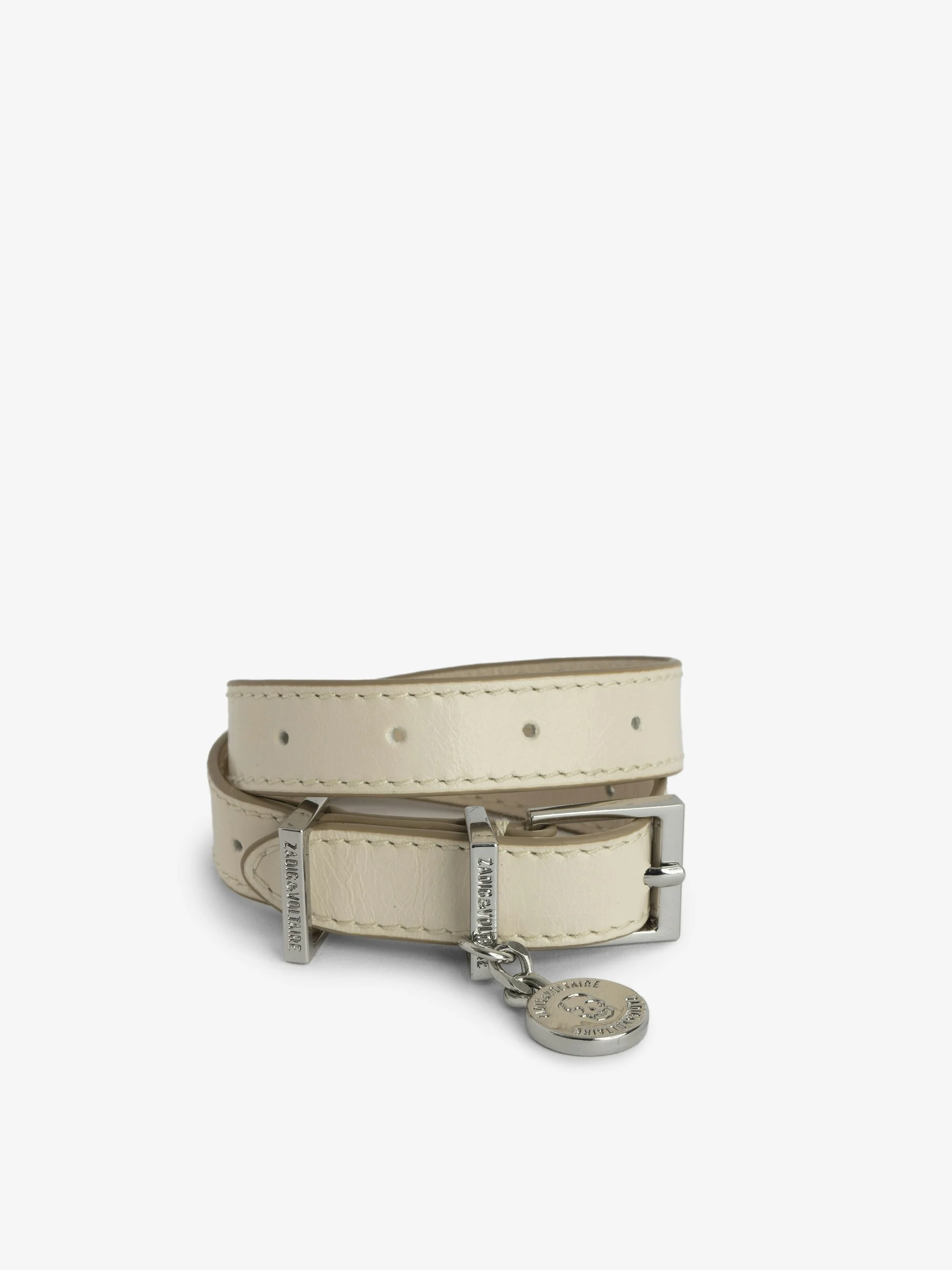 Vintage-effect ivory patent leather double-wrap bracelet with medallion charm and belt buckle. Description & details - Double wrap bracelet in vintage-effect cream patent leather for women - Holes, metal buckle, and Zadig&Voltaire medallion charm 38.5 cm Composition 100% Cow leather Care - Clean you jewellery with a soft, dry cloth - Avoid contact with water and chemicals (fragrance, cosmetics, chlorine, hydroalcoholic gel) - Protect your jewellery from humidity and any source of heat - Avoid sleeping with your jewellery on - Store your jewellery in its protective pouch " Product code: OWJW01753_FLASH