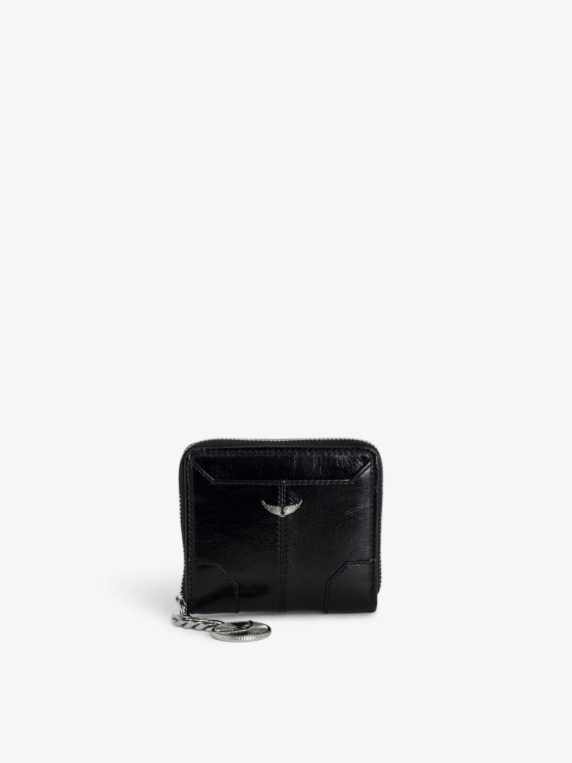 Vintage-effect patent leather purse with medallion and signature wings. Description & details - Women’s purse in black patent leather with vintage effect - Zip fastening with metal medallion pull tab - 3 card slots, one coin compartment with press studs, one double pocket - One flat pocket - Metal wings - Topstitching - Embossed with Zadig&Voltaire Width x height x depth: 10,5 x 9,5 x 2 cm Composition 100% COW LEATHER Care - Protect your leather item from humidity and any source of heat (radiator, sun) - Avoid your item coming into contact with water - Regularly care for your leather item using a colourless nourishing cream for leather, suitable for leather goods - In case of stains, contact a leather professional Product code: LWBA02518_NOIR