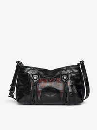 Small vintage-inspired patent leather bag with adjustable shoulder strap and punk wings and tag signature. Description & details - Vintage-inspired patent leather bag - Punk animation - Adjustable leather shoulder strap - Zip closure - Zipped gussets to expand the bag - Interior zipped pocket - Wings signature - Can be worn on the shoulder or cross-body 21 x 12.5 x 8 cm Composition 100% Cow leather Care - Protect your leather item from humidity and any source of heat (radiator, sun) - Avoid your item coming into contact with water - Regularly care for your leather item using a colourless nourishing cream for leather, suitable for leather goods - Ensure you wear your item with similar colours - Avoid overfilling your bag to ensure its durability - In case of stains, contact a leather professional Product code: LWBA03951_BLACK