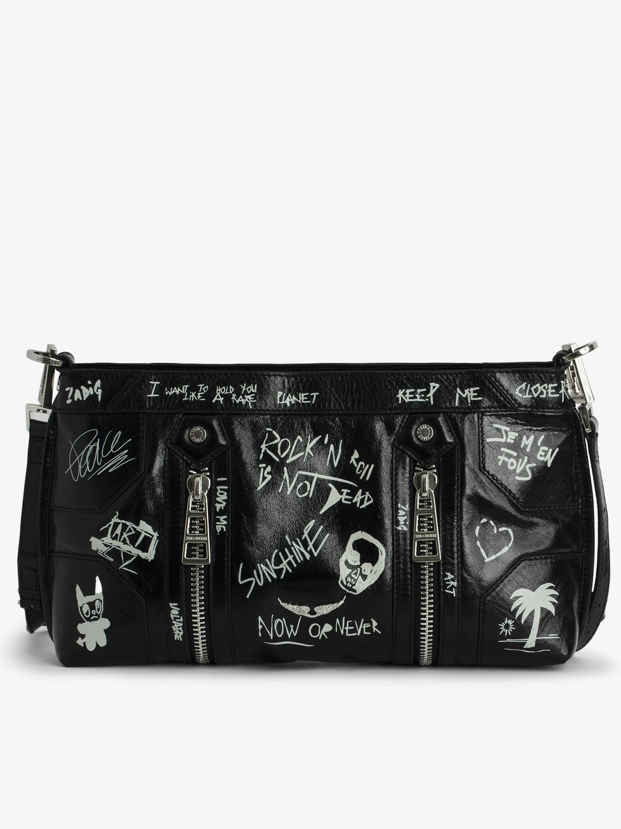 Vintage-effect patent leather bag with graffiti, adjustable shoulder strap, and signature metal wings. Description & details - Sunny Mood black vintage-effect patent leather women's bag - Removable leather shoulder strap - Zip fastening - Expandable zipped gussets - One interior zipped pocket - Tag print and signature metal wings - Wear on the shoulder or cross-body 31.5 x 18 x 7.5 cm Composition 100% Cow leather Care - Protect your leather item from humidity and any source of heat (radiator, sun) - Avoid your item coming into contact with water - Regularly care for your leather item using a colourless nourishing cream for leather, suitable for leather goods - Ensure you wear your item with similar colours - Avoid overfilling your bag to ensure its durability - In case of stains, contact a leather professional Product code: LWBA03900_NOIR