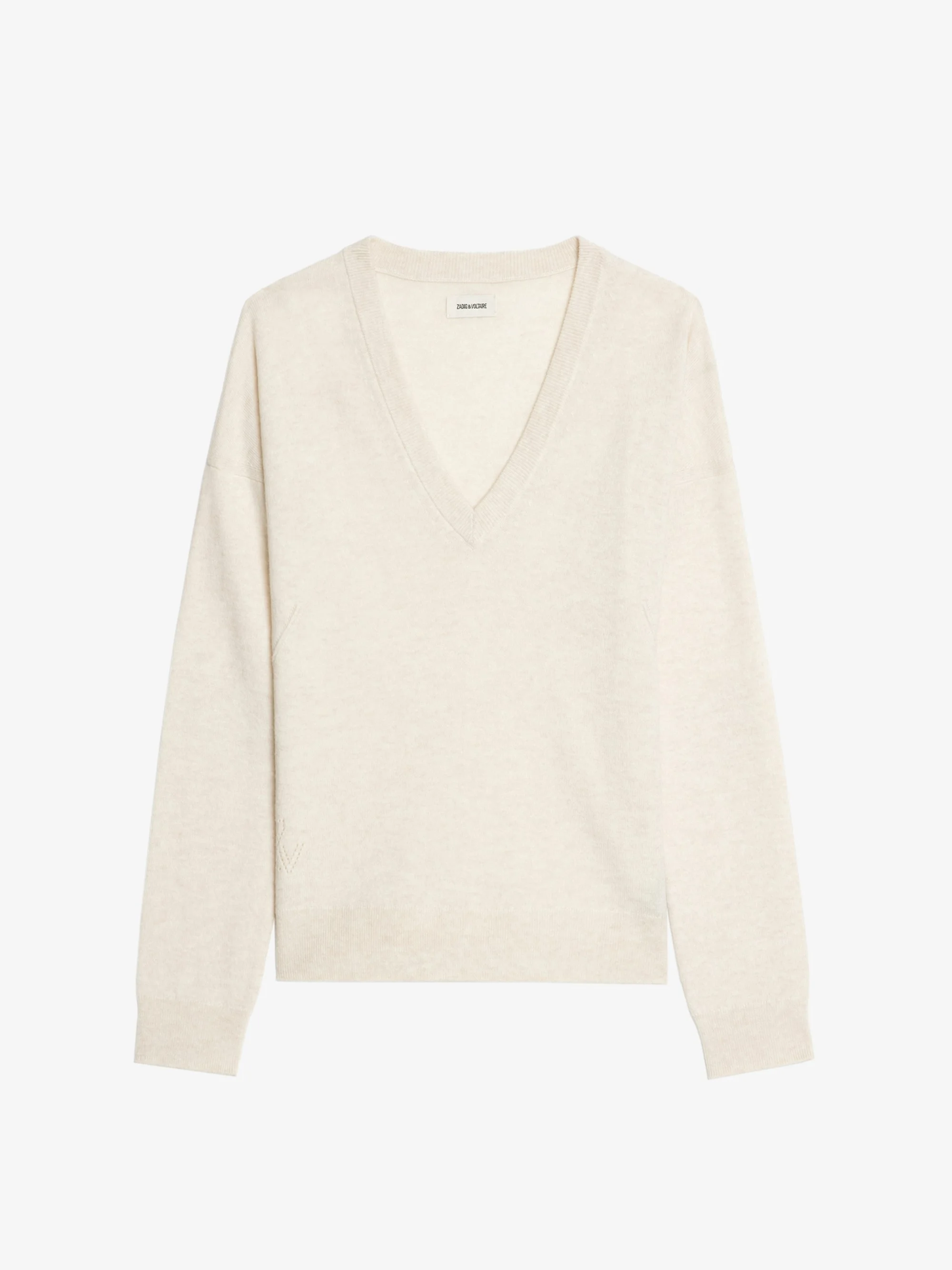 V-neck sweater with heart patch on elbows. Description & details - Sweater in 100% cashmere - Heart patch on elbows - V-neck - Long sleeves - ZV logo Model is 180 cm / 5' 10" and is wearing a size S This item fits true to size. Choose your usual size. Composition 90% Wool* 10% Cashmere Care - Hand-wash or machine-wash on a 20°C wool cycle with a maximum spin speed of 400 rpm - Do not wring - Air dry flat - Iron inside out at a maximum of 110°C, avoiding any customised details Product code: KWSW02816_ECRU