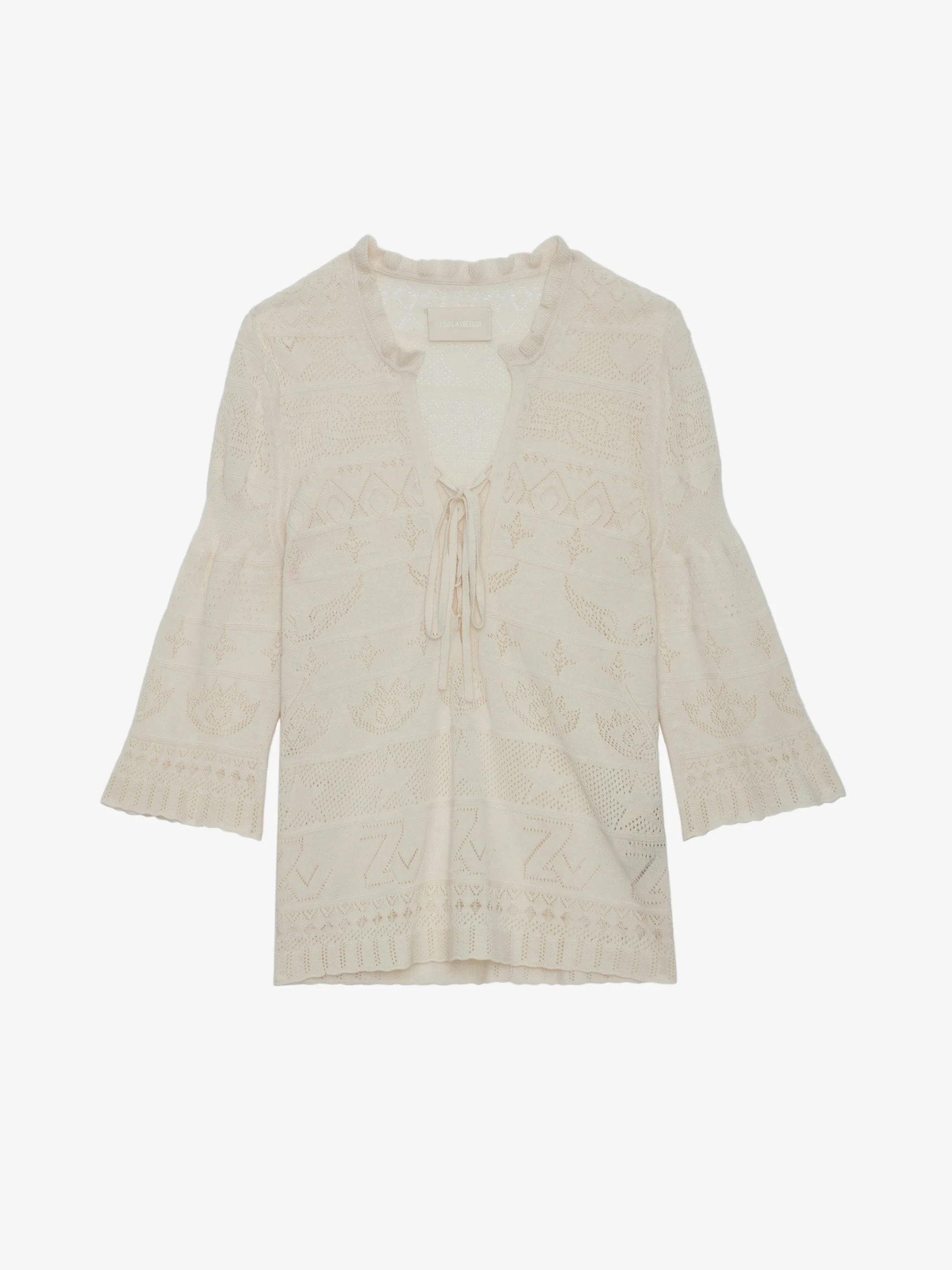 Ecru lace cotton sweater with 3/4-length sleeves, openwork motifs and ties. Description & details - Women’s ecru lace cotton sweater - Openwork motifs - Gathered open collar with drawstring ties - 3/4-length sleeves Model is 177 cm / 5' 9" and is wearing a size S This item is true to size. We recommend buying your usual size. Composition 100% COTTON* Care - Hand-wash or machine-wash on a 20°C wool cycle with a maximum spin speed of 400 rpm - Do not wring - Air dry flat - Iron inside out at a maximum of 110°C, avoiding any customised details Product code: KWSW01635_ECRU