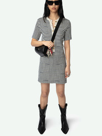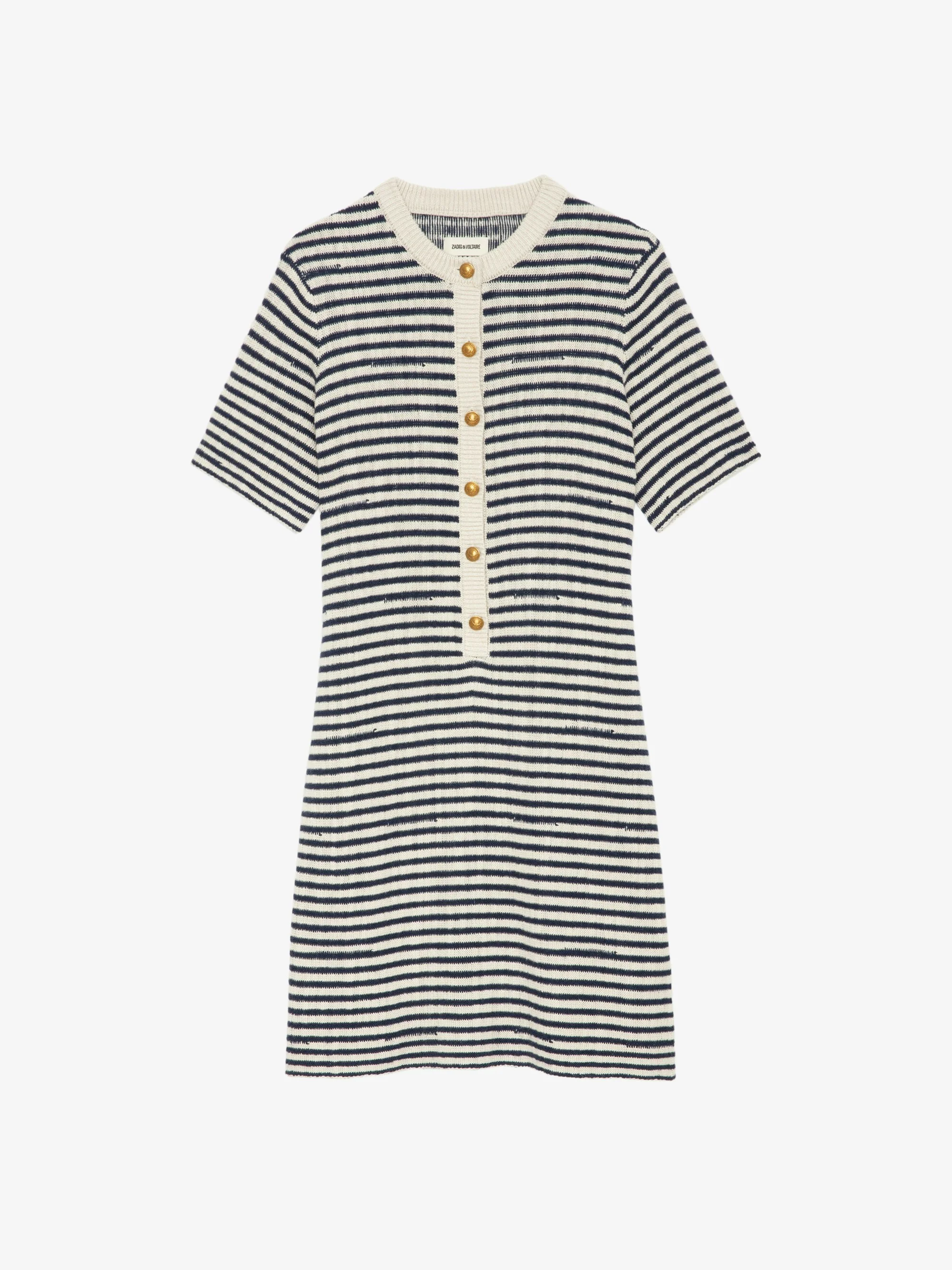 A chic fusion of nautical inspiration and contemporary style. This short-sleeved sailor dress features a refined buttoned collar, exuding a timeless elegance that seamlessly aligns with the brand's modern aesthetic. Crafted in a deep encre striped print, the Tahoe Dress is perfect for the fashion-forward woman seeking a versatile piece that transitions effortlessly from day to night. Description & details - Short sailor dress - Striped print - Buttoned round collar - Short sleeves Model is 171 cm / 5' 7" and is wearing a size S This item is true to size. We recommend buying your usual size. Composition 56% Cotton* 23% Viscose 13% Linen 5% Polyester 3% Metallic fiber Care - Hand-wash or machine-wash on a 20°C wool cycle with a maximum spin speed of 400 rpm - Do not wring - Air dry flat - Iron inside out at a maximum of 110°C, avoiding any customised details Product code: KWDR01189_ENCRE