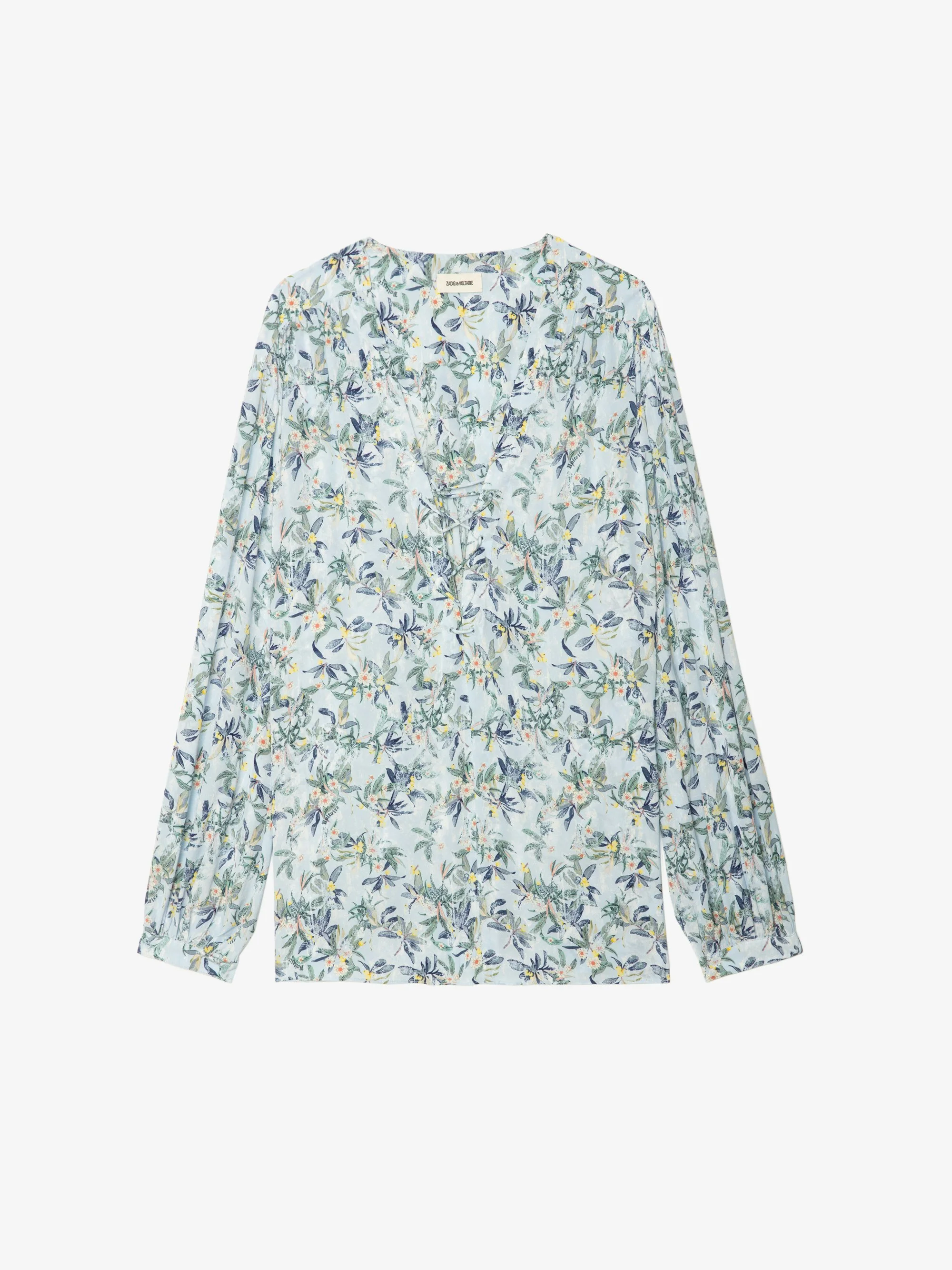 Printed viscose tunic with long balloon sleeves and lace-up neckline. Description & details - Tunic in 100% viscose - Floral print - Long balloon sleeves - Lace-up neckline Model is 175 cm / 5' 8" and is wearing a size S This item fits true to size. Choose your usual size. Composition 100% Viscose Care - Hand-wash or machine-wash inside out in a mesh laundry bag on a 20°C delicate cycle with a maximum spin speed of 400 rpm - Air dry flat - Iron inside out at a maximum of 110°C Product code: WWSH02237_CLOUD