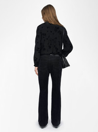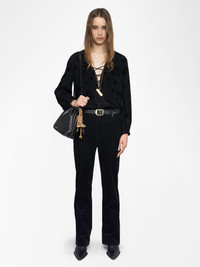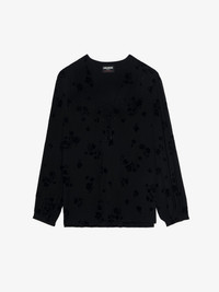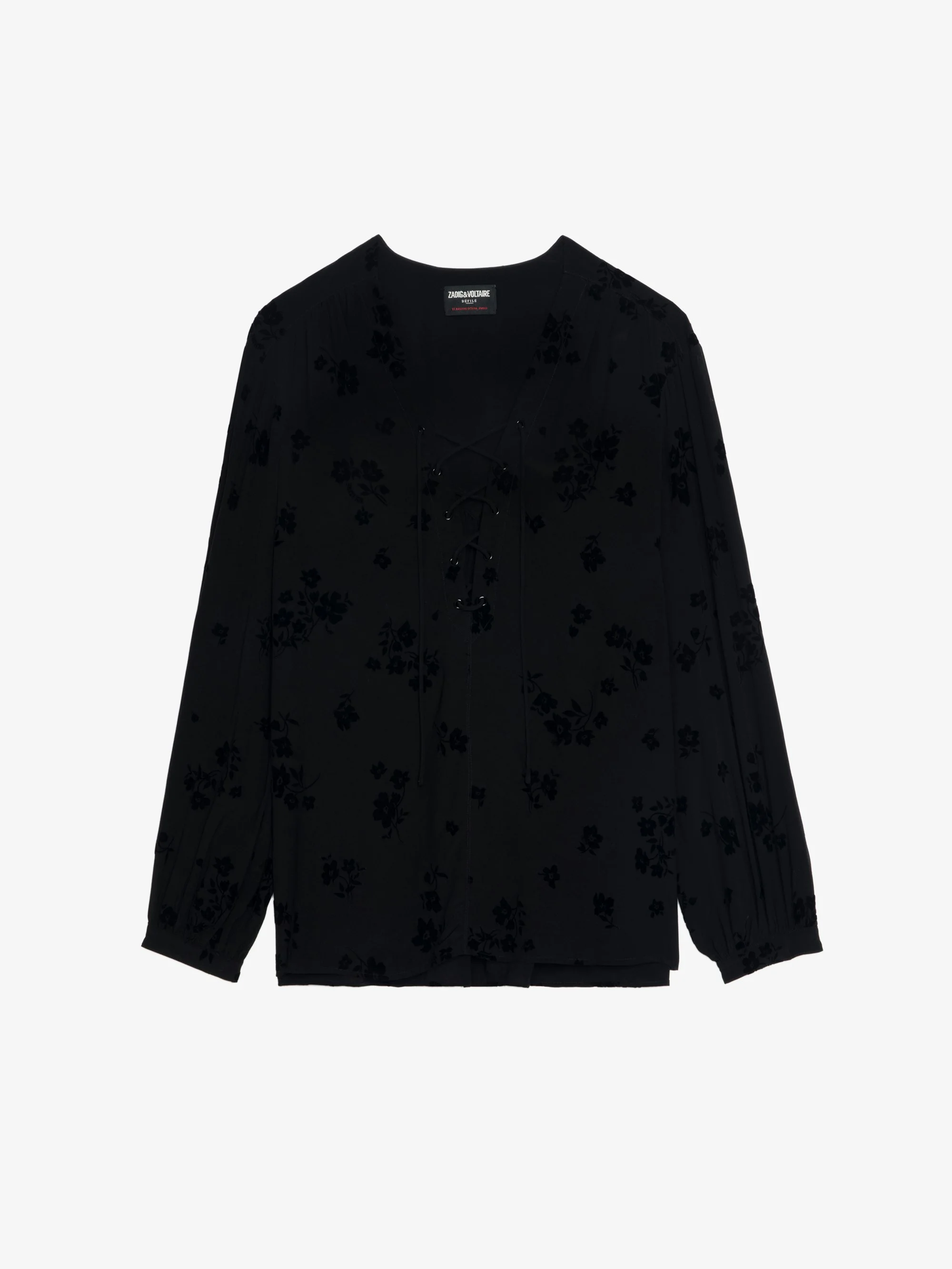 Flocked viscose tunic with long balloon sleeves and laced neckline. Description & details - Shirt - Flocked floral pattern - Deep neckline - Lace-up closure - Long balloon sleeves Model is 180 cm / 5' 10" and is wearing a size S This item has a loose fit. For a more fitted look, choose one size down from your usual size. Composition 100% Viscose** Care - Hand-wash or machine-wash inside out in a mesh laundry bag on a 20°C delicate cycle with a maximum spin speed of 400 rpm - Air dry flat - Iron inside out at a maximum of 110°C Product code: WWSH02263_BLACK