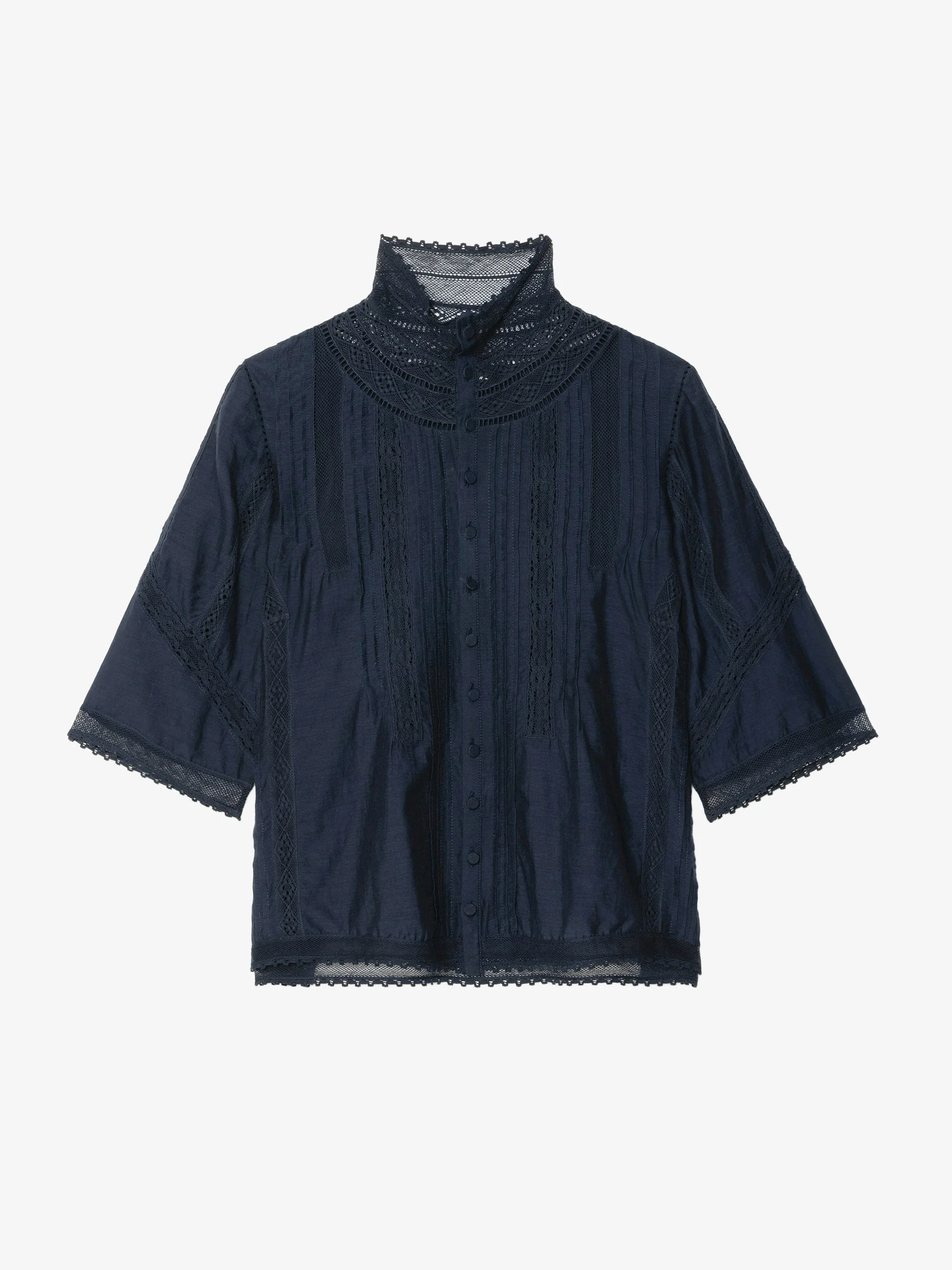 Short sleeved top with lace embroidery Description & details - Lingerie style top - Inlaid lace throughout - Button closure down front - Short sleeves This item fits true to size. Choose your usual size. Composition 75% Cotton** 25% Viscose** Product code: WWTO02001_ENCRE