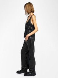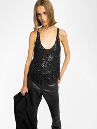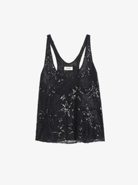Lace tank top embroidered with sequins and pearls. Description & details - Sleeveless transparent top - Lace embroidered with sequins and beads - Racerback - U-neckline Model is 177 cm / 5' 9" and is wearing a size S This item fits true to size. Choose your usual size. Composition 100% Polyamide** Care This garment should be dry-cleaned only. Product code: WWTO01990_BLACK