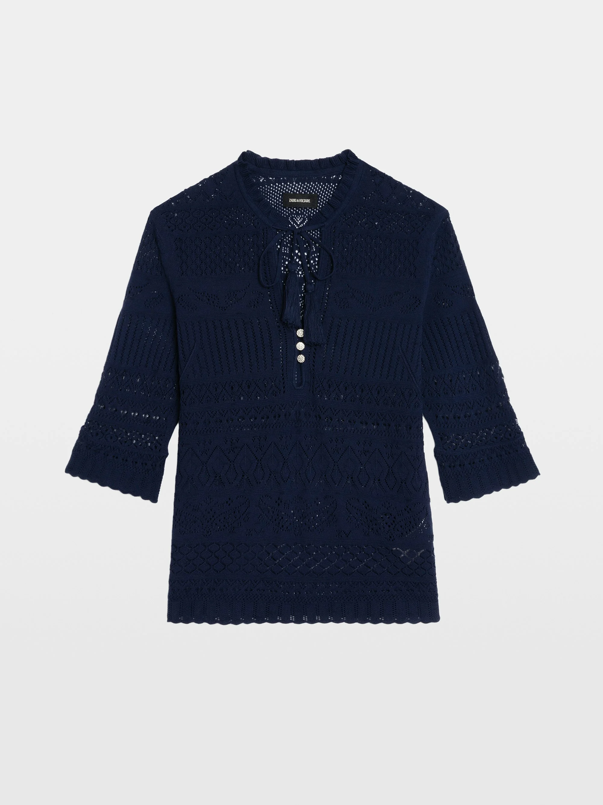 Pointelle cotton top. Description & details - 100% cotton top - Pointelle - Buttoned neckline with pom-pom ties - 3/4 sleeves Model is 178 cm / 5' 10" and is wearing a size S This item fits true to size. Choose your usual size. Composition 100% Cotton* Care - Machine-wash inside out on a 30°C delicate cycle with similar colours - Air dry - Iron inside out at a maximum of 110°C, avoiding any customised details Product code: KWTO01138_MARINE