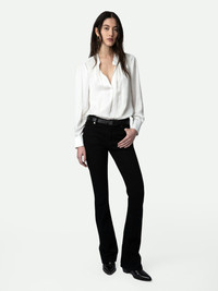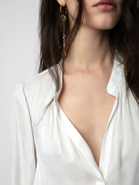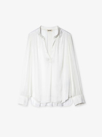 Zadig&Voltaire women's white top. Description & details Season after season, Zadig&Voltaire’s signature Tink tunic blouse proves to be a must-have for women’s wardrobes. With its light, satiny fabric, it is the perfect addition to a casual or chic look. - Zadig&Voltaire Women’s white flowing tunic blouse - Mao collar - Long sleeves - Buttoned cuffs - Gathering details Model is 178 cm/5'10" and is wearing a size S Model is 178 cm / 5' 10" and is wearing a size S This item is true to size. We recommend buying your usual size. Composition 57% POLYESTER** 43% POLYESTER Care - Hand-wash or machine-wash inside out in a mesh laundry bag on a 68°F delicate cycle with a maximum spin speed of 400 rpm - Air dry flat - Iron inside out at a maximum of 230°F Product code: PWGCP3201F_BLANC