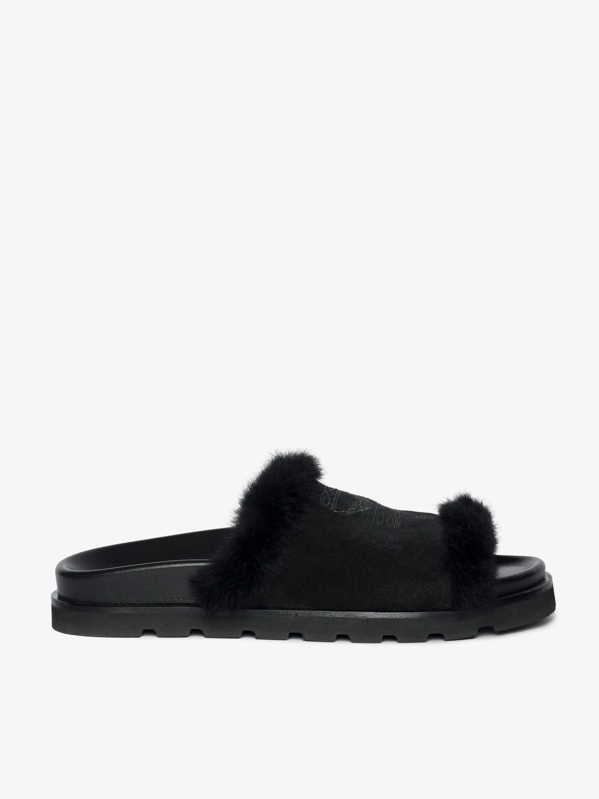 Open mules in suede and shearling adorned with signature embroideries and fitted with comfortable anatomical soles. Description & details - Open mules in suede and shearling - Signature embroidery - ZV signature - Comfortable anatomical sole This item fits true to size. We recommend choosing your usual size. Composition 100% Cow leather Care - Protect your leather item from humidity and any source of heat (radiator, sun) - Avoid your item coming into contact with water - Regularly maintain the shine of your smooth or grained leather shoes with a leather polish Product code: SWCT02081_BLACK