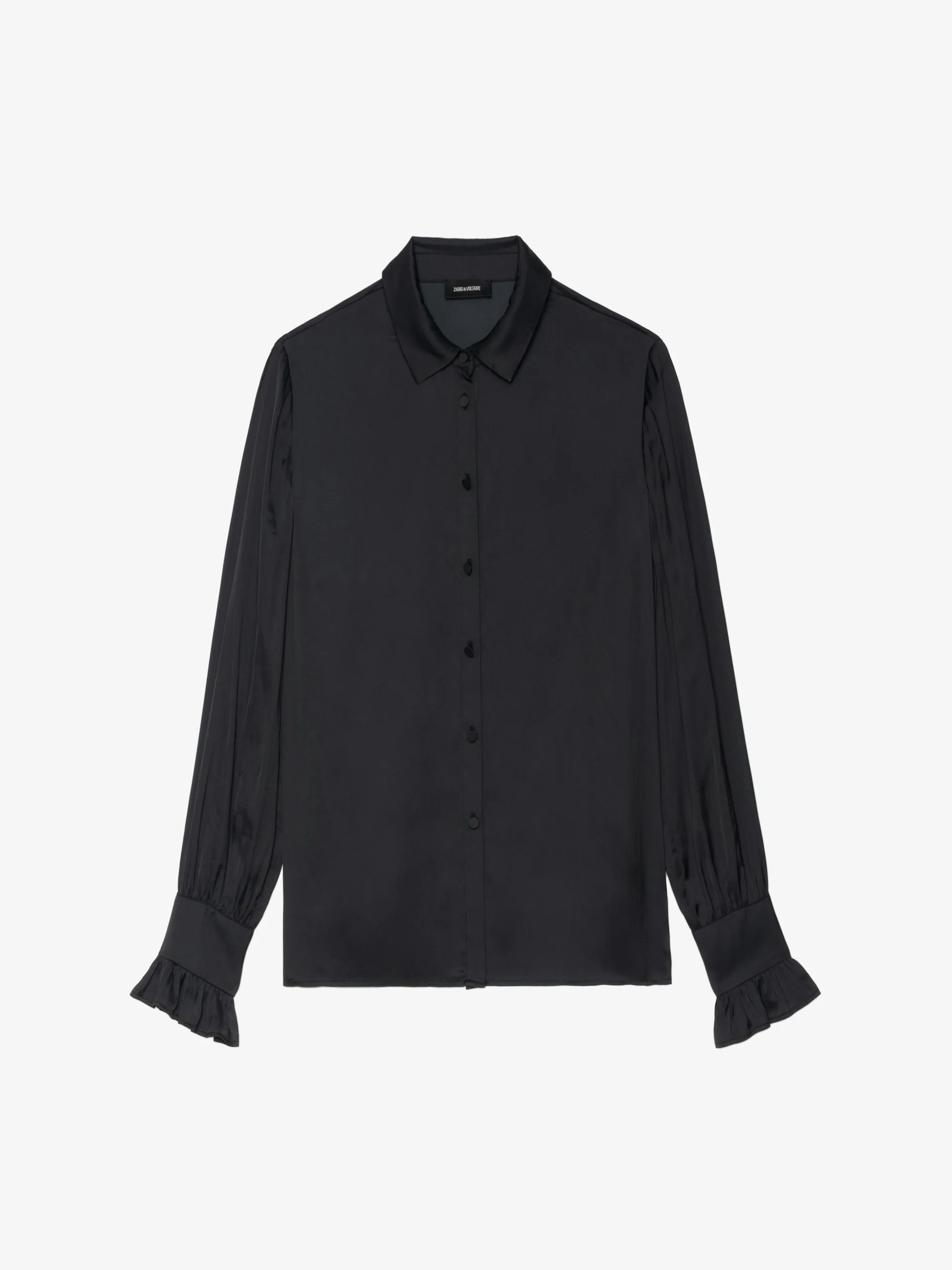 Satin shirt with long sleeves, button fastening, and a wing-shaped rhinestone detail on the back. Description & details - Flowing black Japanese satin shirt for women - Shirt collar with button fastening - Long sleeves with buttoned, ruffled cuffs - Wings adorned with rhinestones on the back Model is 177 cm / 5' 9" and is wearing a size S This item is true to size. We recommend buying your usual size. Composition 57% Polyester** 43% Polyester Care - Hand-wash or machine-wash inside out in a mesh laundry bag on a 20°C delicate cycle with a maximum spin speed of 400 rpm - Air dry flat - Iron inside out at a maximum of 110°C Product code: WWSH02226_BLACK