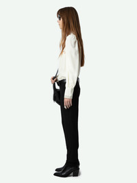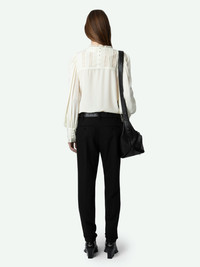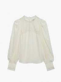Lingerie-style silk blouse with lace inlay. Description & details - Lingerie-style blouse in silk - Stripes of inlaid lace - Round collar - Button fastening at back - Long puffed sleeves and ruffled buttoned cuffs Model is 175 cm / 5' 8" and is wearing a size S This item is true to size. We recommend buying your usual size. Composition 100% Silk Care - Hand-wash or machine-wash inside out in a mesh laundry bag on a 20°C delicate cycle with a maximum spin speed of 400 rpm - Air dry flat - Iron inside out at a maximum of 110°C Product code: WWSH00585_FLAKE