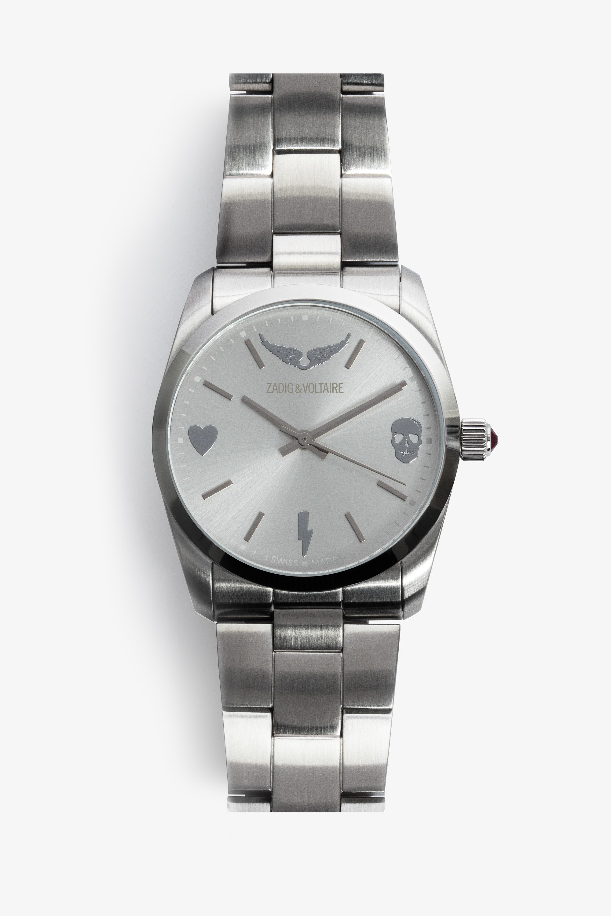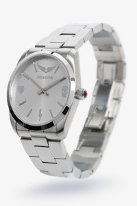 Women's stainless steel watch with silver face Description & details Switch to Zadig&Voltaire time with this stainless steel watch set with a rhinestone, with a silver face in the signature style of the brand. - Zadig&Voltaire women's stainless steel watch - Silver grey face with signature patterns - Diameter 36 mm - Contrasting rhinestone - Quartz movement - Hour/minute/second functions - Steel watchband Composition 100% STEEL Product code: OWWT00090_SILVER