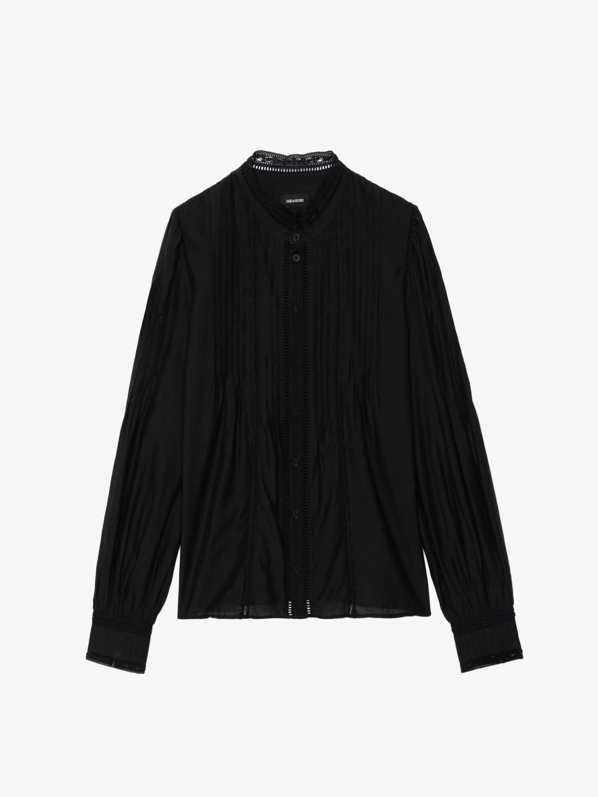 Long sleeved lacy blouse with button closure down front. Description & details - Women's long sleeved blouse - Lace details on sleeves and slight pleating down front - Button closure down front - Long sleeves with button closure at cuffs This item fits true to size. Choose your usual size. Composition 75% Cotton** 25% Viscose** Care - Machine-wash inside out on a 30°C delicate cycle with similar colours - Air dry - Iron inside out at a maximum of 150°C, or in case of customised details, at a maximum of 110°C avoiding the customised details Product code: WWSH02280_BLACK