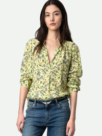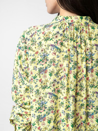 Women’s yellow floral blouse with open collar. Description & details - Women’s Cedra yellow flowing blouse - All over floral print - Open collar - Gathered details and pleats at the back - Long sleeves and buttoned cuffs Model is 174 cm / 5' 8" and is wearing a size S This item is true to size. We recommend buying your usual size. Composition 100% VISCOSE Product code: WWSH00569_CEDRA
