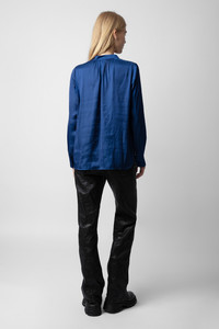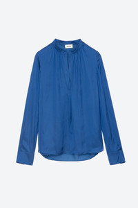 Women’s royal blue blouse with open collar. Description & details - Women’s flowing royal blue blouse - Open collar - Gathered details and pleats at the back - Long sleeves and buttoned cuffs Model is 177 cm / 5' 9" and is wearing a size S This item is true to size. We recommend buying your usual size. Composition 57% POLYESTER** 43% POLYESTER Care Hand-wash or machine-wash your garment at a maximum of 68°F, in a mesh laundry bag and inside out, with a gentle spin cycle. Air-dry. Iron your garment on a low heat setting or steam from a distance of 8", being particularly careful with customized details. Product code: WWSH00021_BLEU ROI