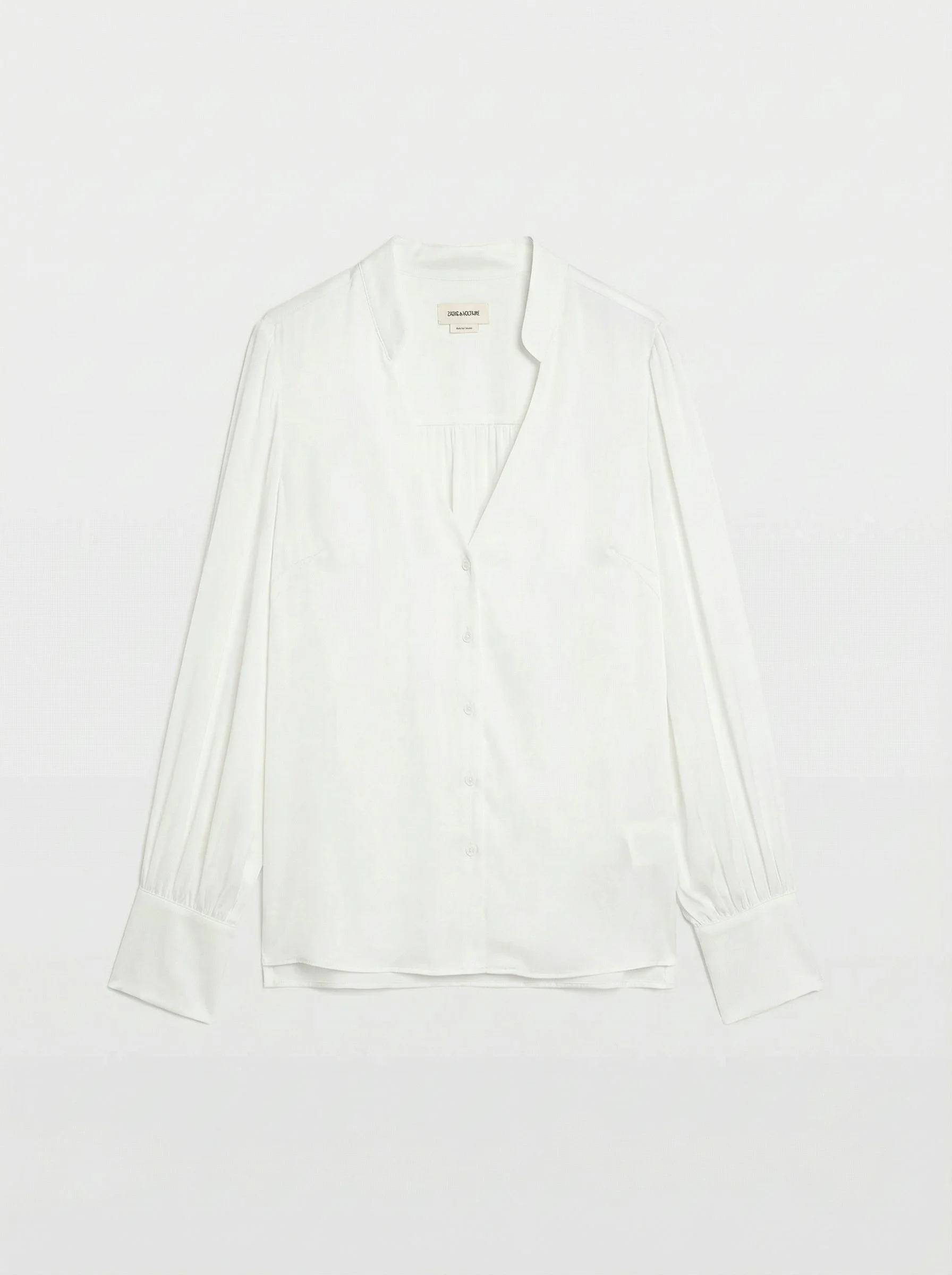 Long-sleeved V-neck satin shirt with cuffs with diamante jewelled buttons. Description & details - Women's satin shirt - V neck and button fastening - Long, full sleeves and fitted cuffs with diamante buttons - Slightly pleated effect in the back and small slits on the sides This item is true to size. We recommend buying your usual size. Composition 51% Polyester* 49% Polyester Care - Hand-wash or machine-wash inside out in a mesh laundry bag on a 20°C delicate cycle with a maximum spin speed of 400 rpm - Air dry flat - Iron inside out at a maximum of 110°C Product code: WWSH00572_JUDO